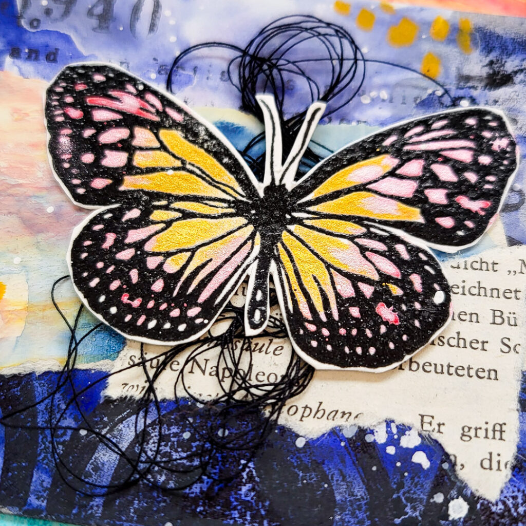 Once the background was done I stamped one image from the Butterflies and Moths stamp set with Versafine Clair in black to Canson Mix Media paper. I immediately covered the stamped images with clear embossing powder. The embossing would resist the metallic watercolors, that I used to colour the butterfly. Metallic watercolors are perfect for butterflies. They give them a really lovely shimmer. Once the butterflies were dry I cut them out and adhered them to the cards together with more collage papers. I added some mark making with an orange Neocolor II crayon.