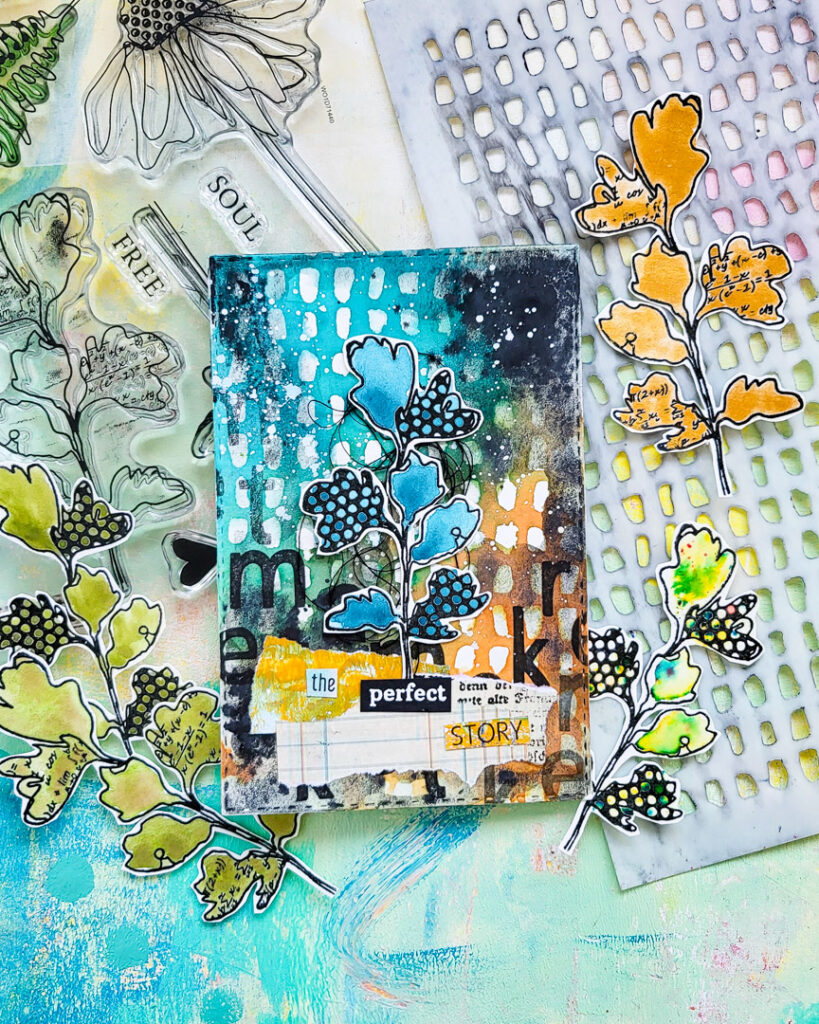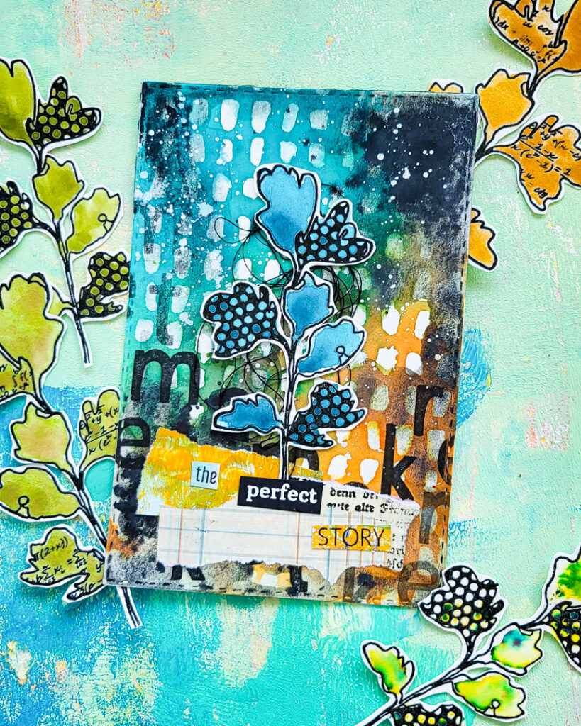 As my focal image I adhered one of the leaves from the Doodle Flowers 2 stamp set combined with a bit of collage and words from Mix A Sentiment.