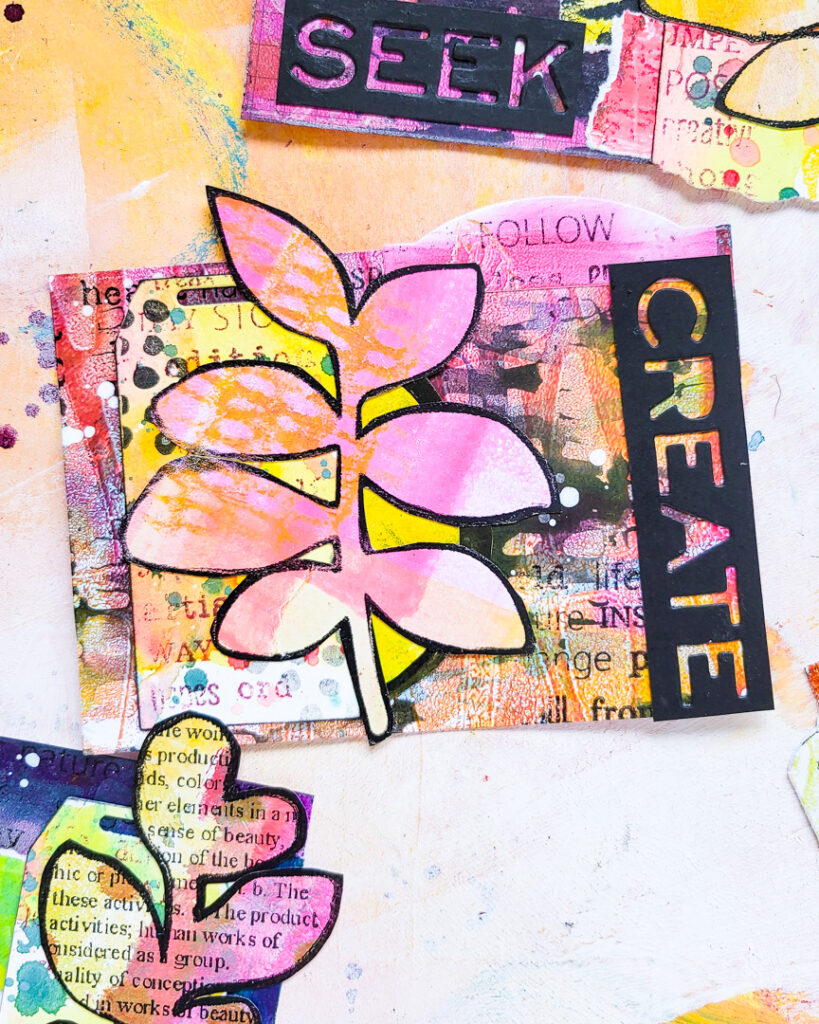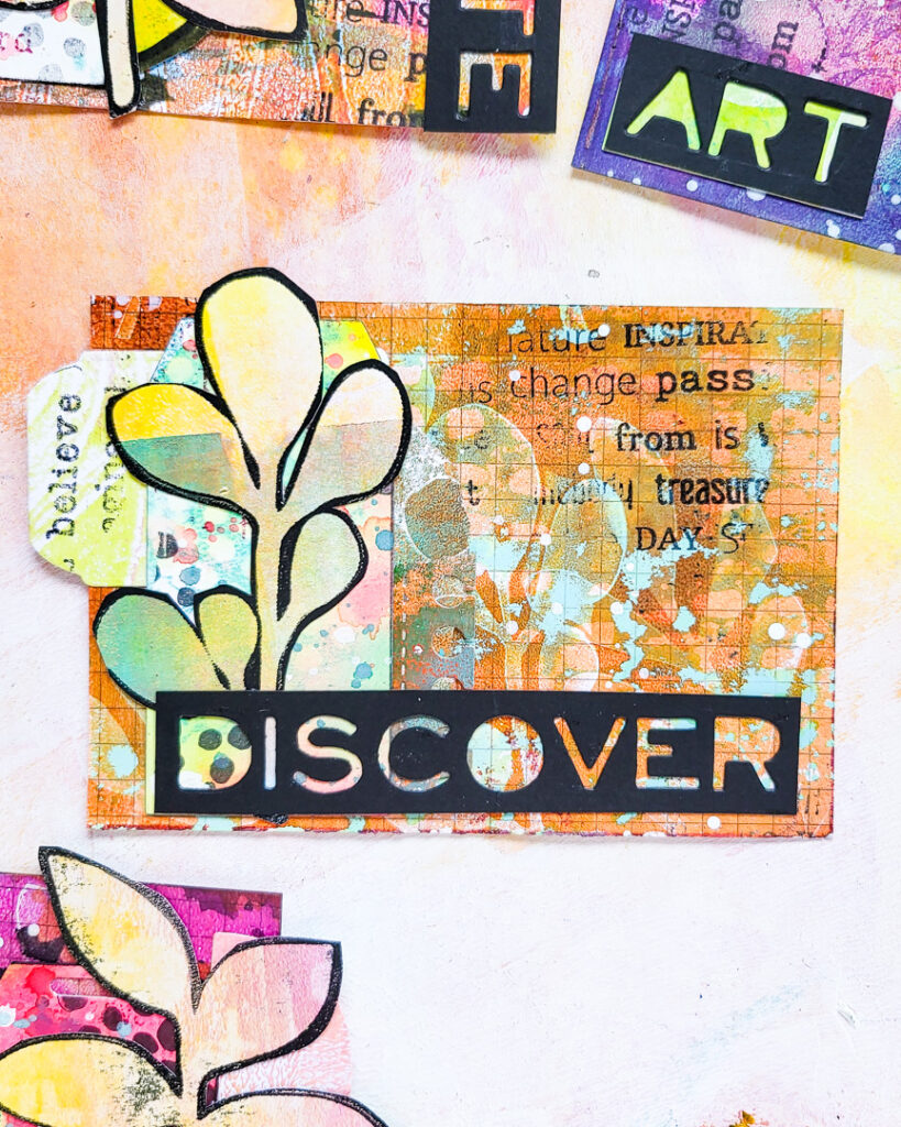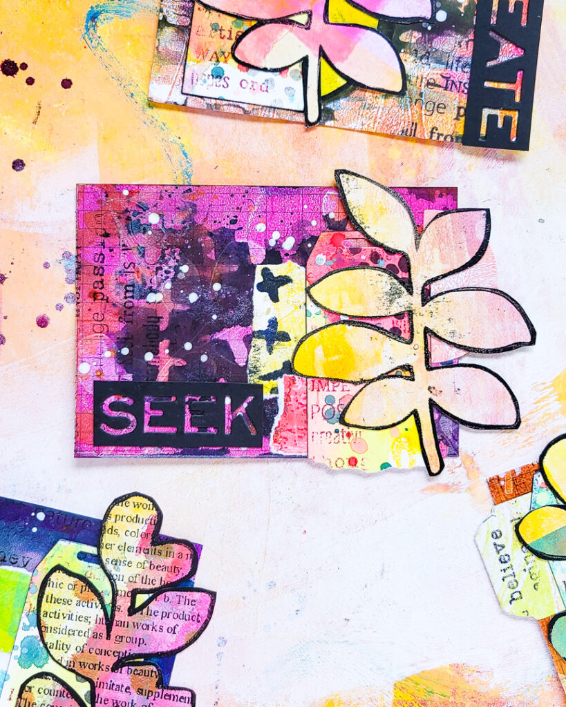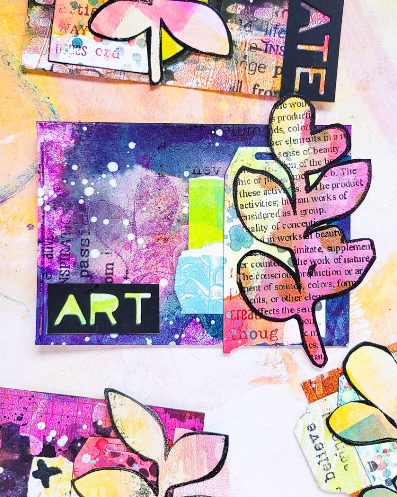I have tons of unfinished index cards laying around. Most of them were inked with Distress Inks and Oxides. I never used them as I was not happy with the backgrounds. So I decided to just print over them with the gelli plate and that turned many of them into really lovely backgrounds. I decoreated them with a bit of background stamping, some colourful tags and collage fodder made with our Sketchy Leaves 6 stencil.