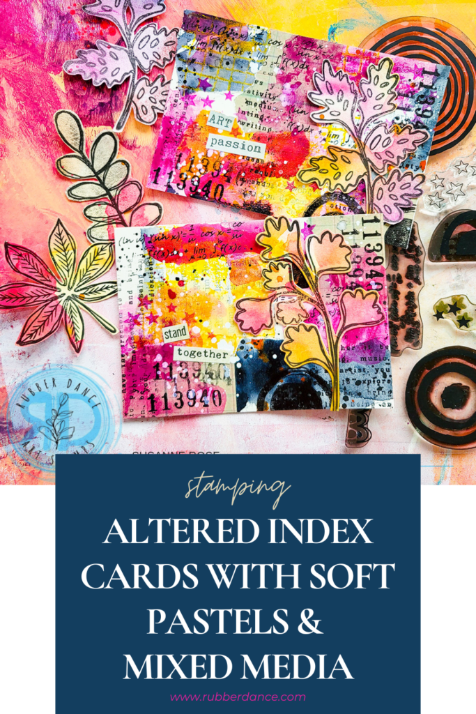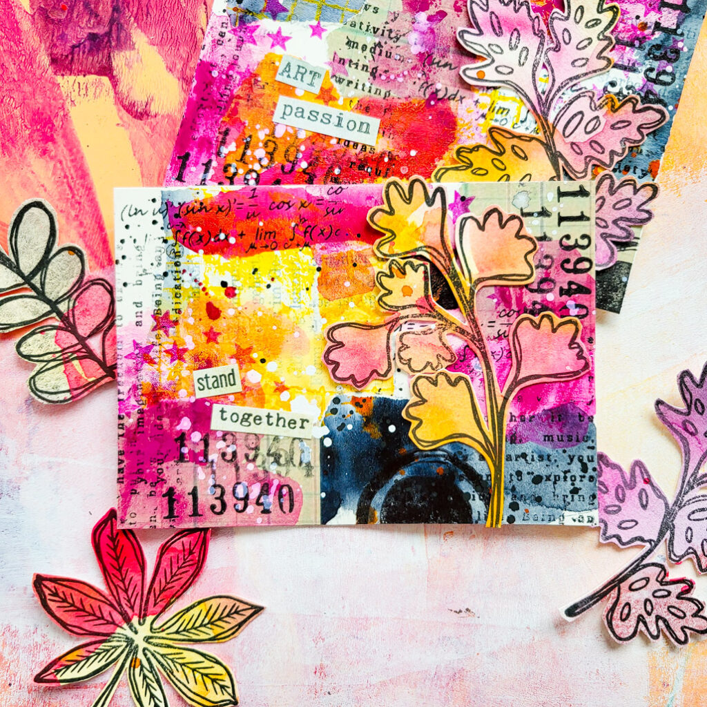 Hi there, Susanne here with some mixed media index cards with some of the leaf stamps from Collage Leaves 2 on a collage background, that is textured with images from Mix It Up 4 and Mix It Up 6.