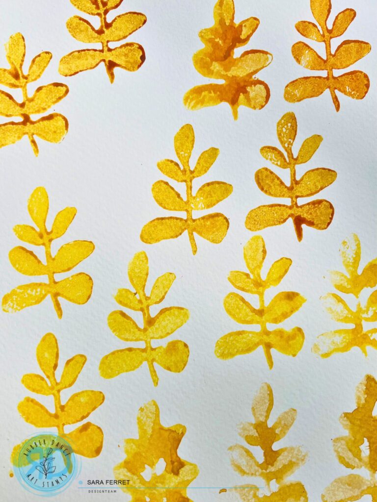 I used the leaves stamp, from Pencil Marks 7 set, with yellow acrylic paint, and I tried to make several combinations of different yellows until I found one that would match the pantone of the postcard.