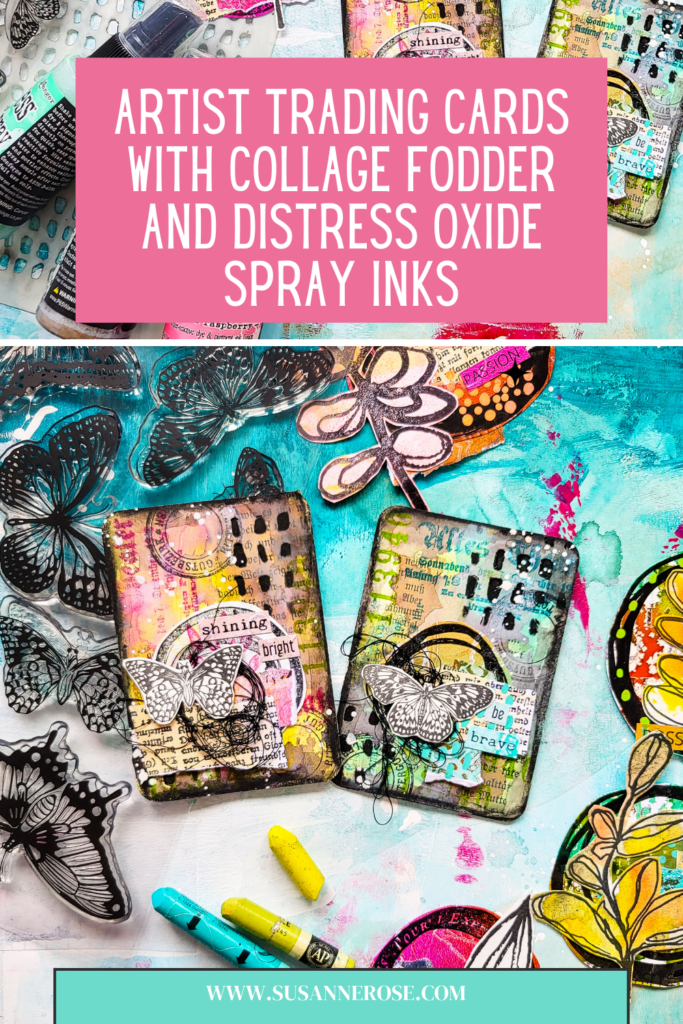 Hi there, Susanne here with a mixed media tutorial. I am sharing two journal cards with a Distress Oxide spray background using our Marks 3 stencil, stamps from Mix It Up 5, Mix It Up 6 and Butterflies and Moths.