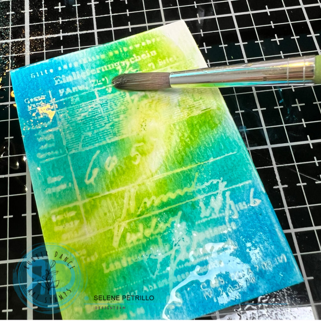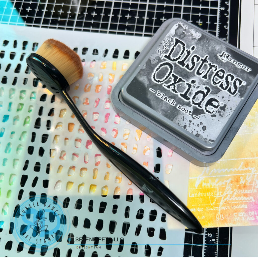 As they are also water reactive, I then decided to use water and a brush to blend them even more. Once they were dry, I used a blending brush and “Black Soot” distress oxide ink on Marks 3 stencil to add texture on the background.