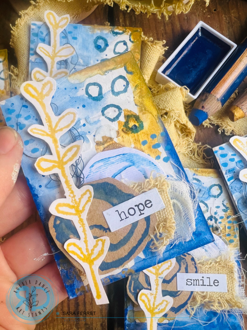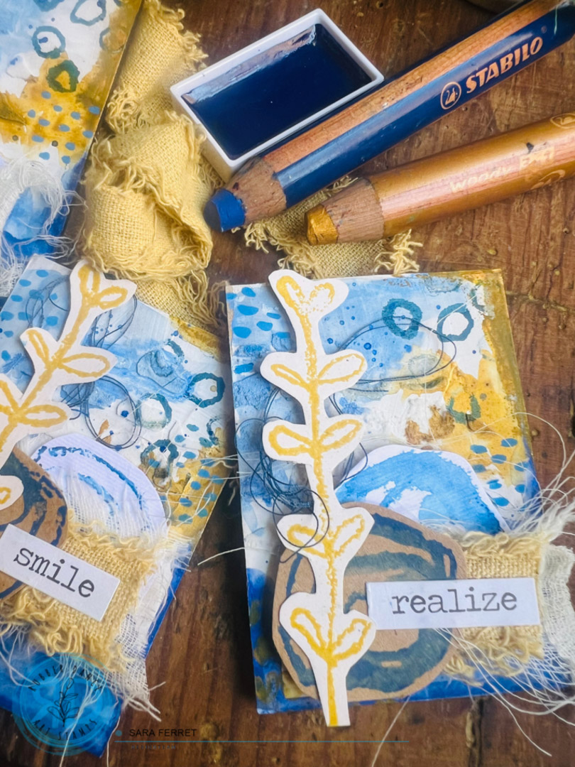 Hi it’s Sara Ferret here with a set of mixed media artist trading cards using stamps from Pencil Marks 1. I have to admit that sometimes starting a creative project without a clear idea is difficult, because the blank paper most of the time blocks us.