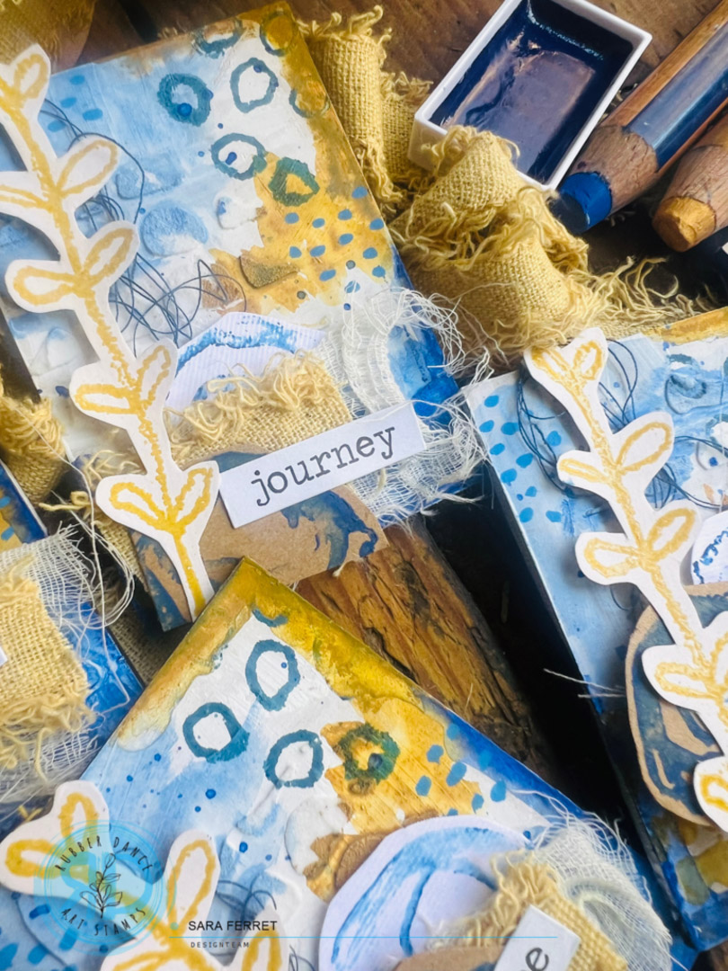 I start with these wooden ATCs with a white gesso background, I apply the stencil pattern of Marks 2 with modeling paste and then I start adding the colors that appear on the inspiration board, I use watercolors, waxes, inks with stamps, acrylic paint markers all in the same color combination.