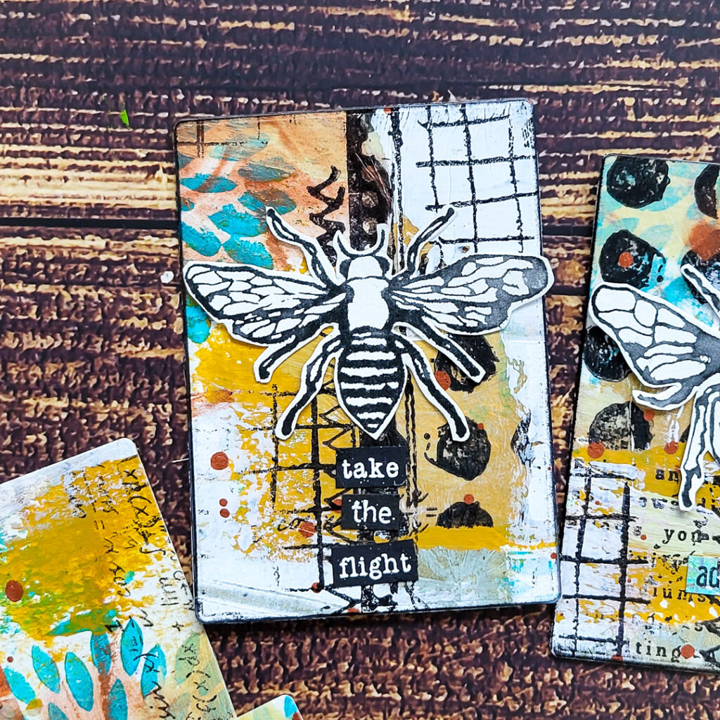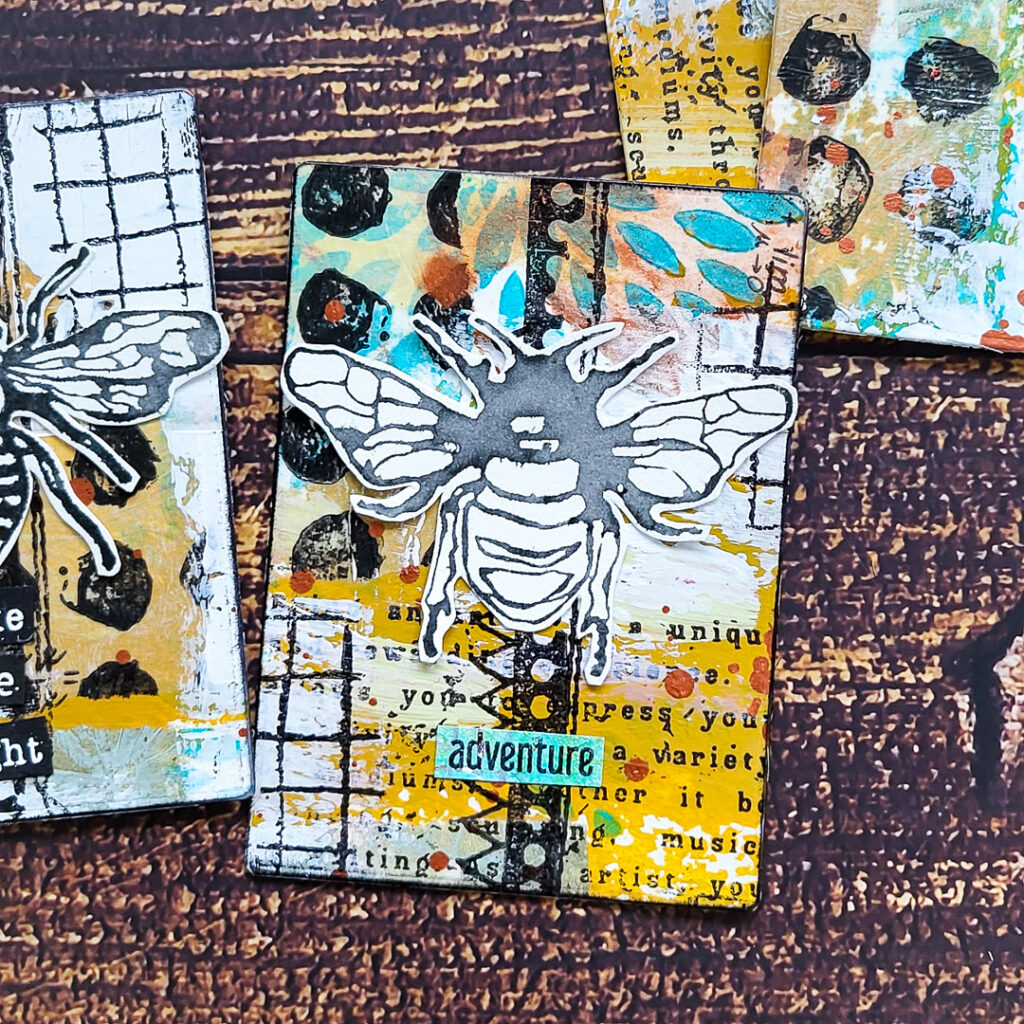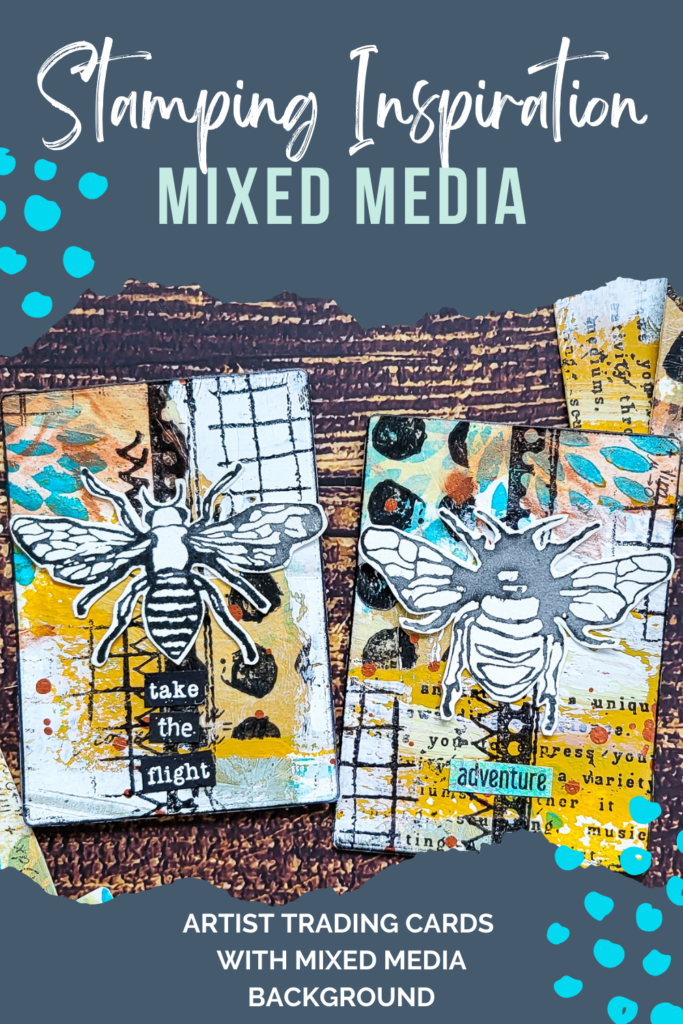 Hi there, Susanne here! I’m sharing a set of two mixed media artist trading cards using stamps from our Inky Friends set. The card base is cut from a masterboard that I created in mixed media. You will find a tutorial linked up at the end of this post