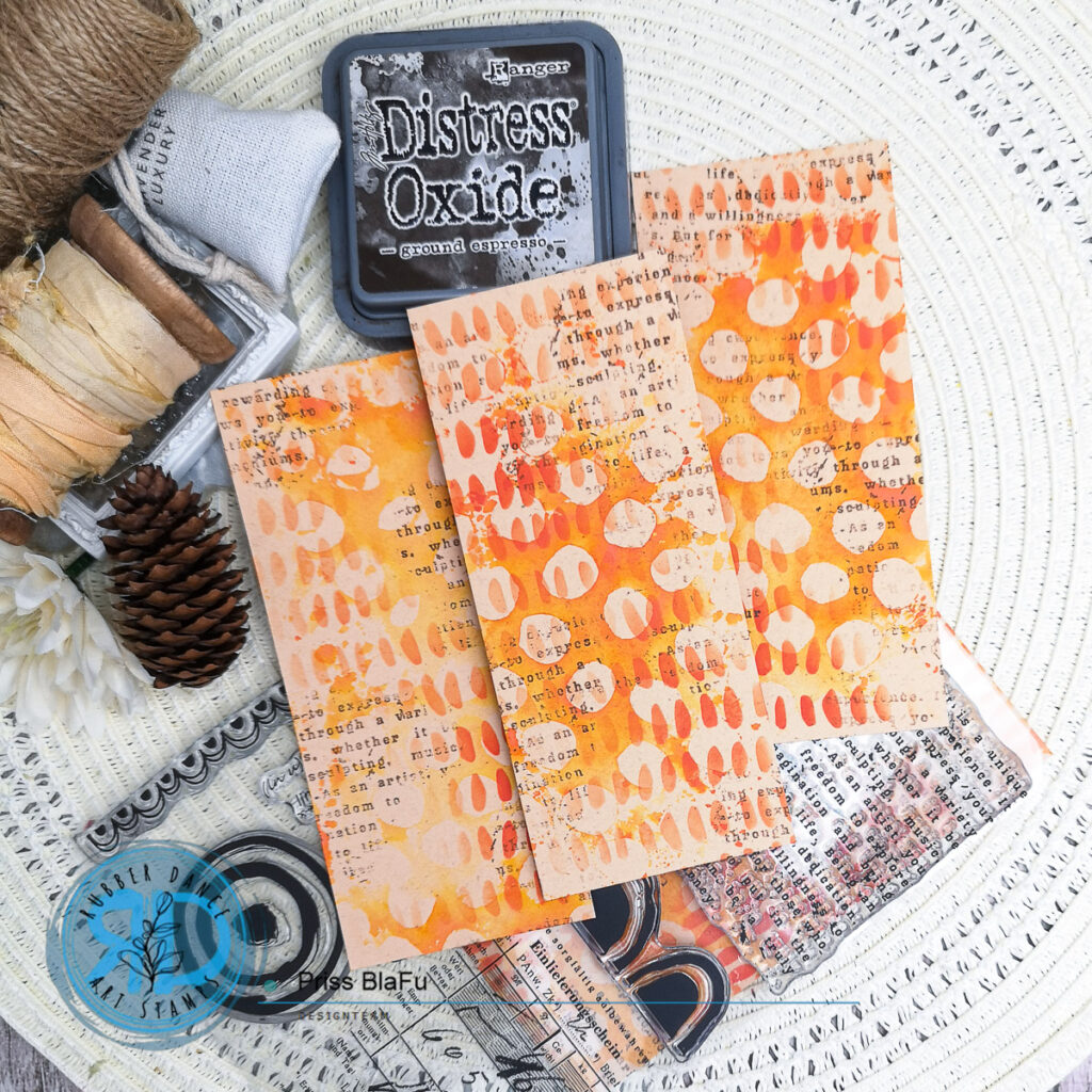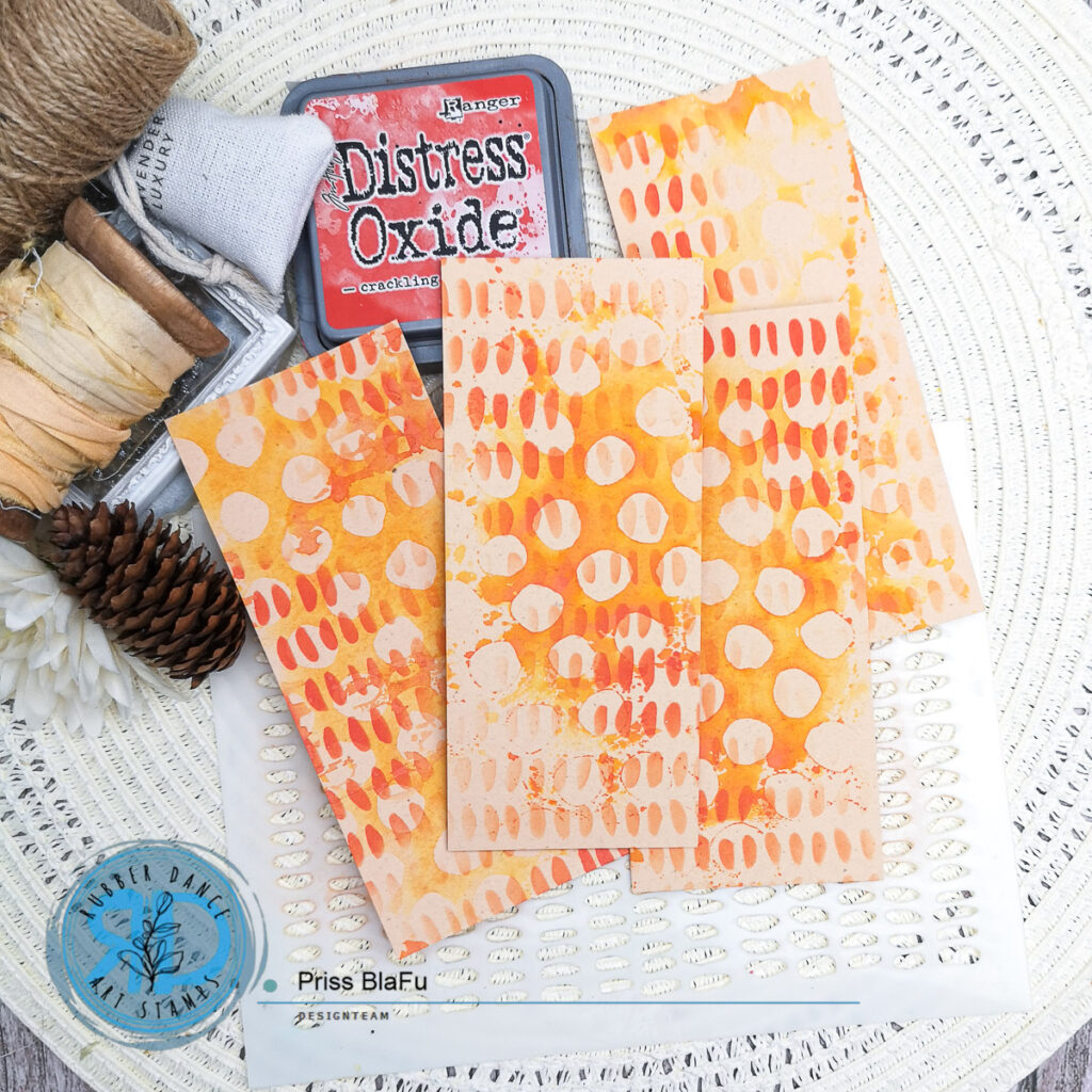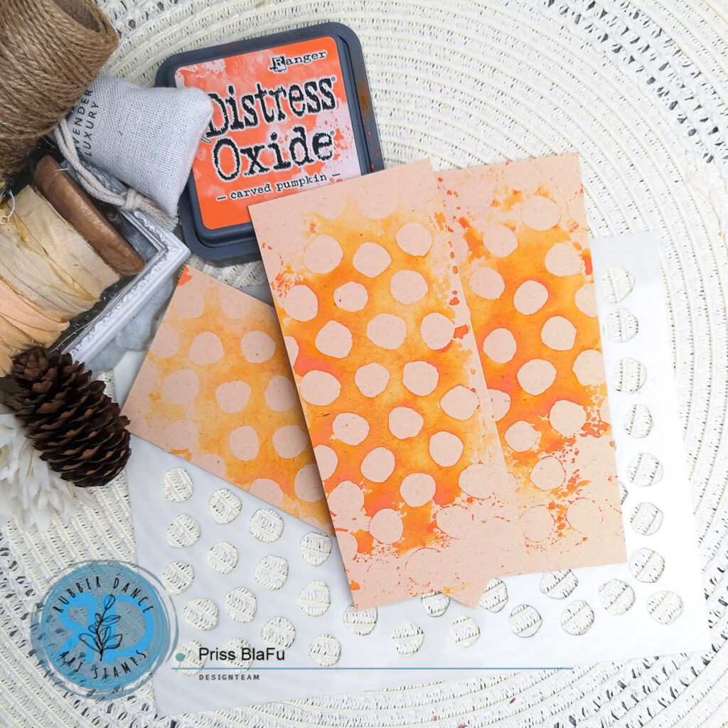 You will need a stencil and water-based inks, I chose Ink Dots Stencil and distress oxide. Place the stencil and apply the inks to it, making sure to cover some parts of the design. Here’s where the magic happens – spritz the inked stencil lightly with water, allowing the colors to blend and soften. The water reacts with the inks, creating a fluid pattern.