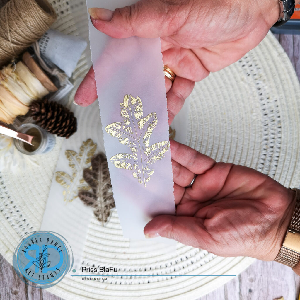 Using Rubber Dance stencils and stamps, I’ve captured the essence of this cozy season with a delicate vellum strip showcasing beautifully embossed gold leaves and an arrow-shaped ‘love’ die-cut. Join me on this artistic journey and let’s craft together with Rubber Dance!