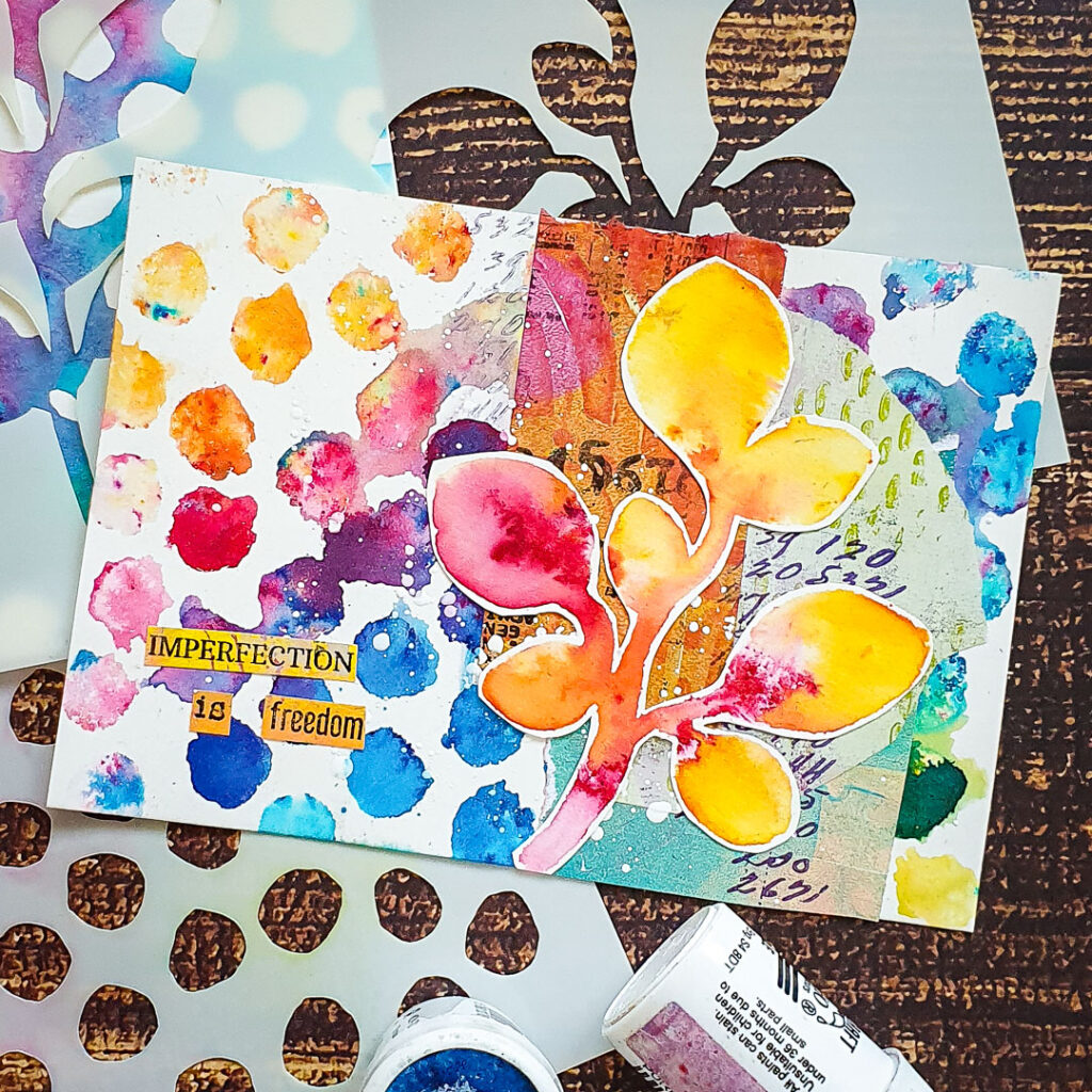 Hi there, Susanne here! I’m sharing a mixed media index card today using stenciled leaves as my focal point. I used our new Sketchy Leaves 1 stencil together with Brushos to create the main images for my cards. In this post I am sharing the steps I took to make the cards including some quick video tutorials.