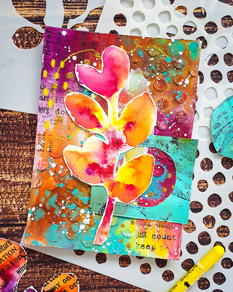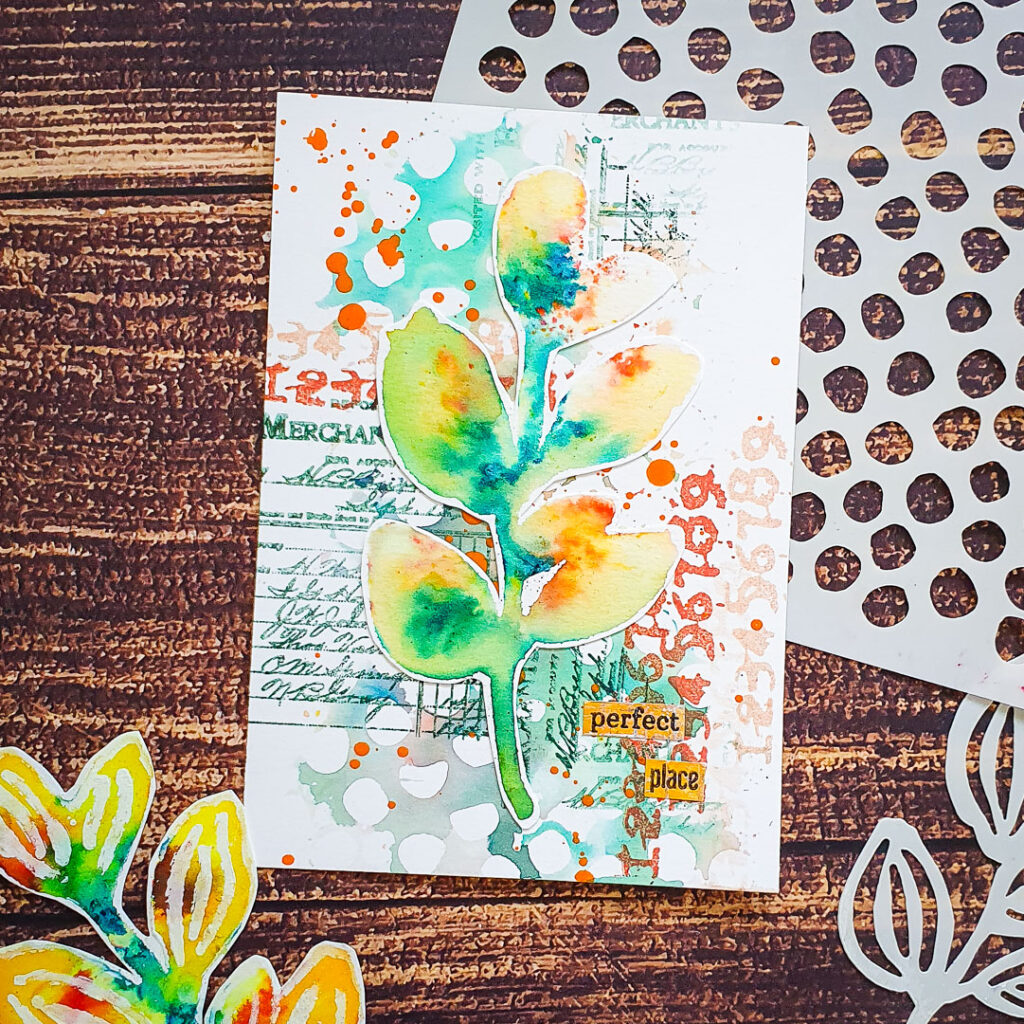 This last card, my favourite one is done with some texture paste that I put down through the Small Ink Dots stencil. I added color with acrylic Inks and mark makings with Neocolors, Stamps and some Distress Glitter in Gold. To make the leaf stand out I adhered some collage elements underneath.