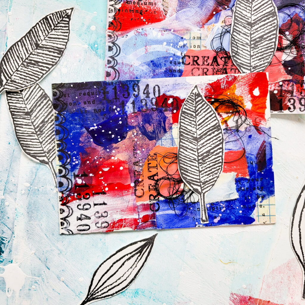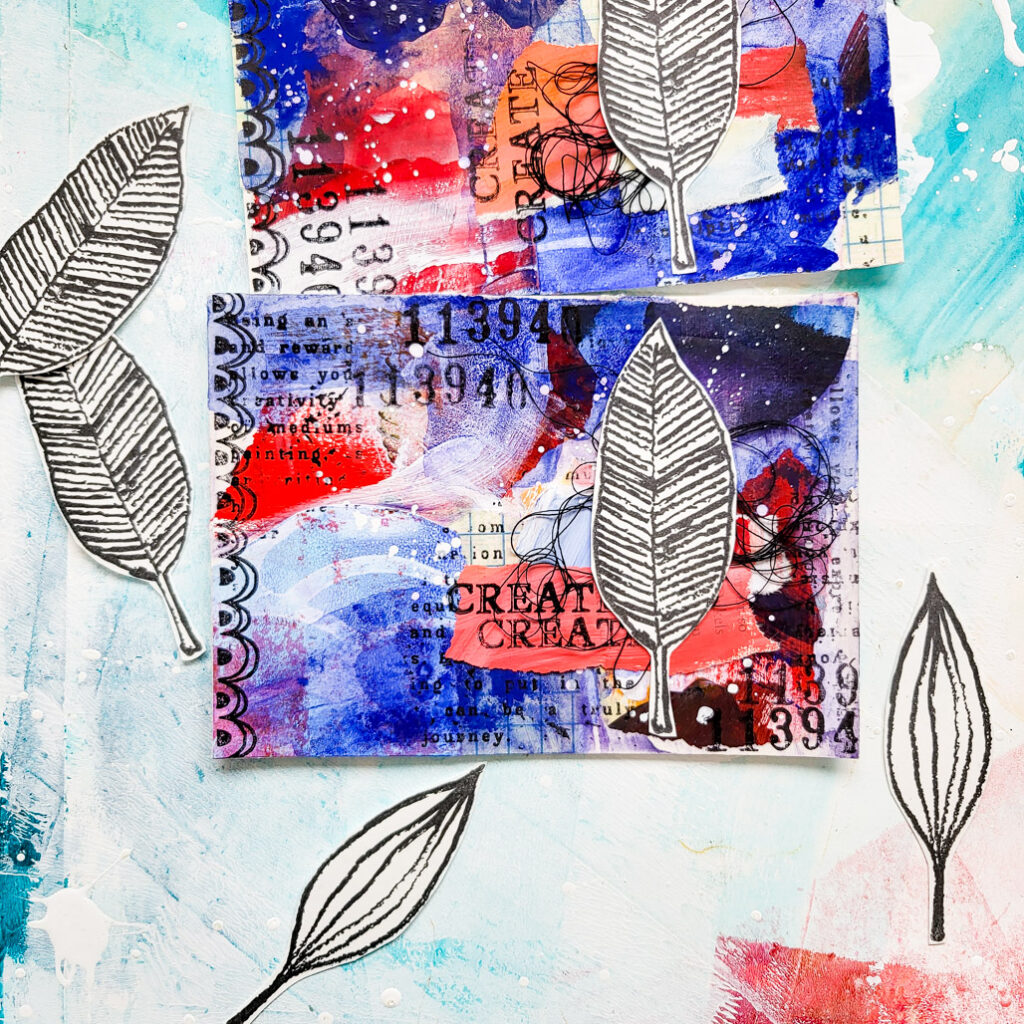 Hi there, Susanne here with some mixed media index cards with a leaf stamp from Pencil Marks 5 on a collage background, that is textured with images from Mix It Up 4 and Mix It Up 6.