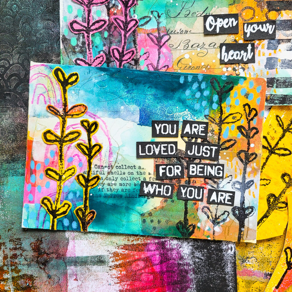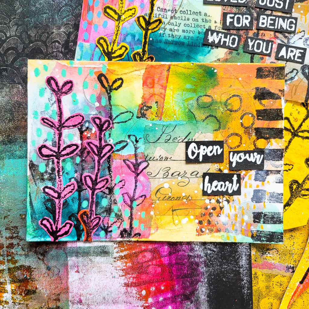 I stamped the botanical elements from Pencil Marks 1 not only to the background, I also stamped them onto some gelli prints and cut them out. I adhered them onto the cards.