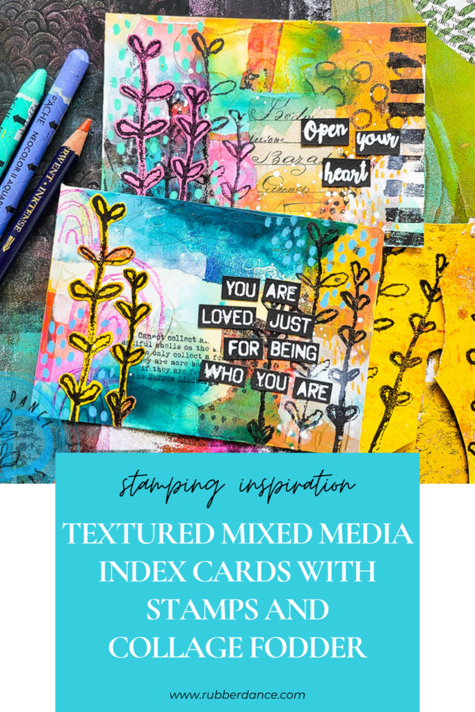 Hi there, Susanne here with a mixed media index card duo using Collage, Derwent Inktense and mark making together with stamps from Pencil Marks 1 and Mixed Sentiments 1 .