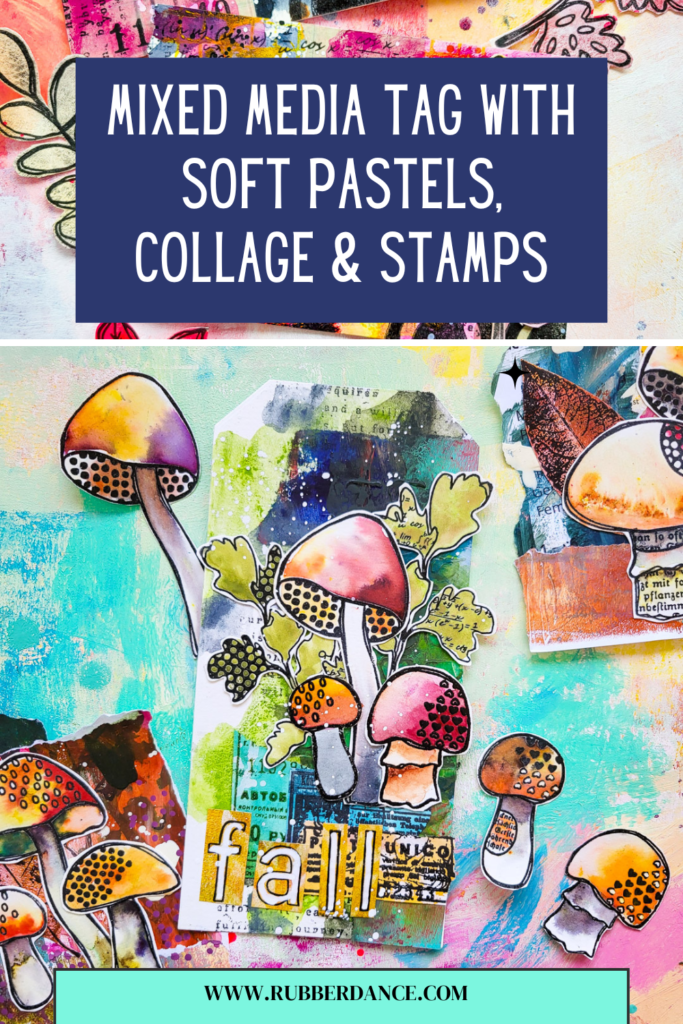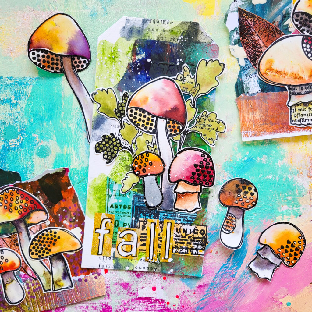 Hi there, Susanne here today sharing a mixed media mini tag using our Textured Mushrooms 2 and Doodle Flowers 2 stamp set on a messy collage background.