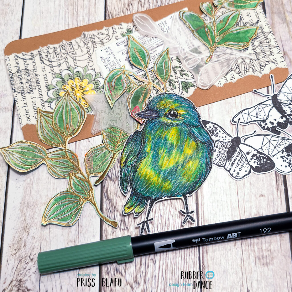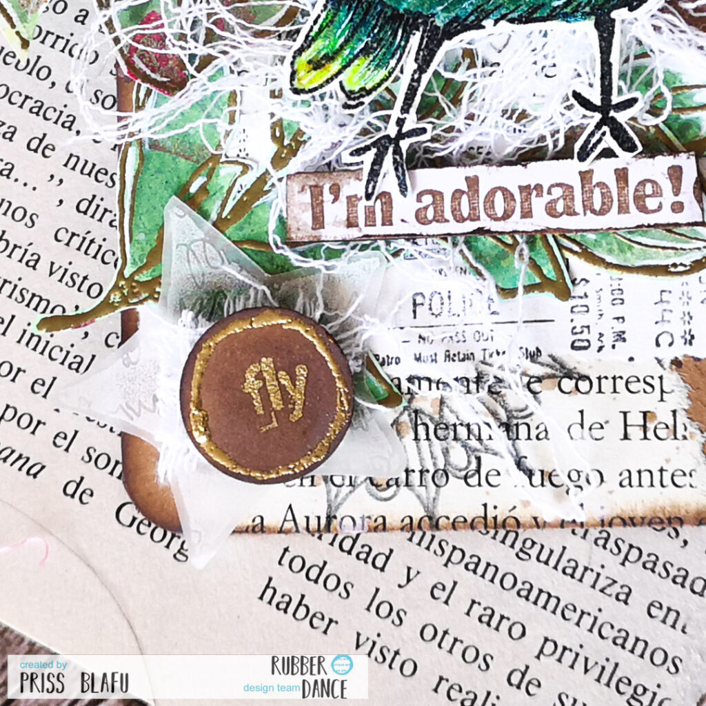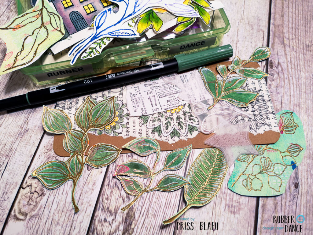 For the elements, I just take my Rubber Dance leftovers box and select some of them to create a composition. I choose some of the Sketchy Leaves set stamped on a Gelli plate background with gold embossing powder, a ticket from the Mixed Media Marks set, and a star from the Mix It Up 2 set.