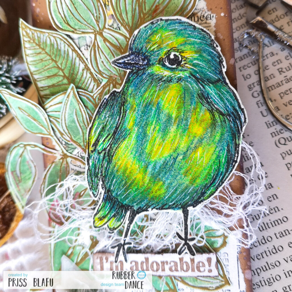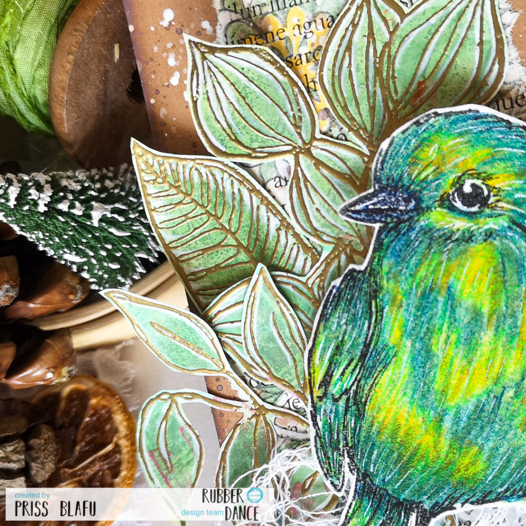 Now it’s time for the focal point. This gorgeous blue-green-yellow bird. I painted it, first with pigments as if they were watercolors, and then I drew some lines with colored pencils and a white gel pen for the highlights.