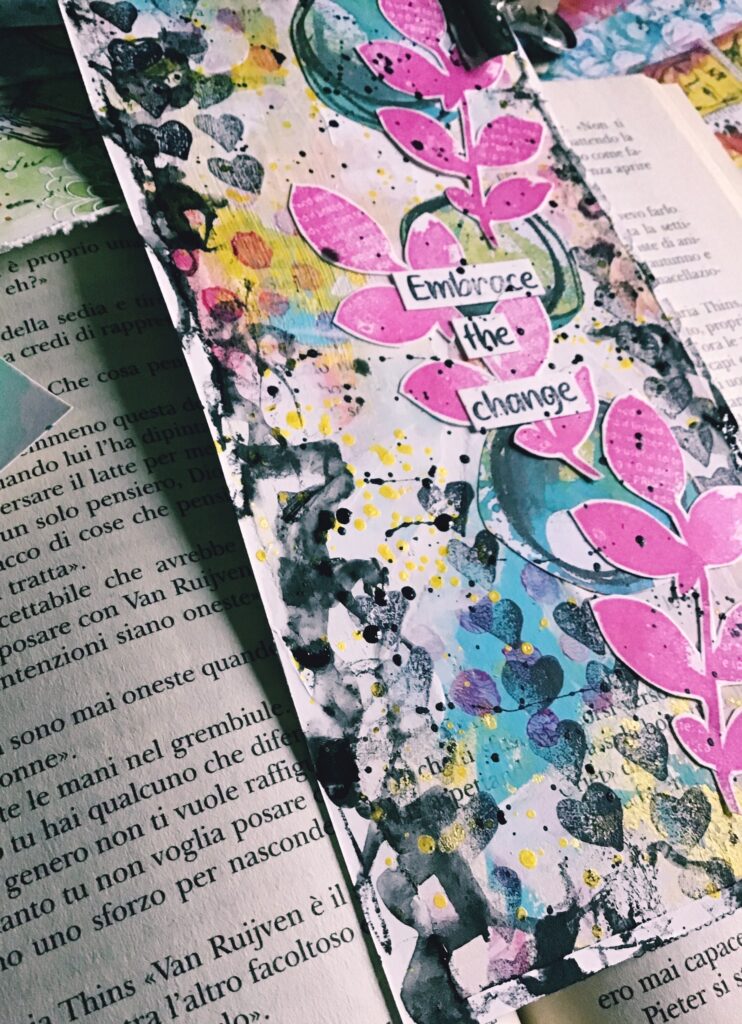 To start I took an old book page and I used Mix It Up #3 clear stamps with acrylic paints and archival inks to create a messy background.