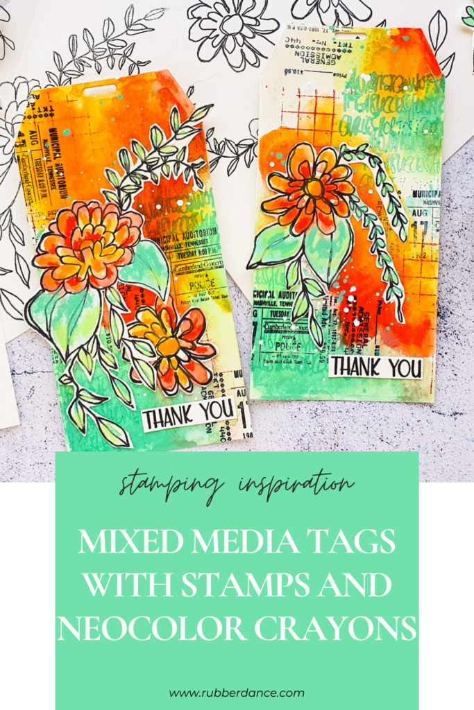 Hi there, Susanne here with two “mixed media” tags using Neocolor II crayons together with stamps from our Sketchy Flowers 3 and Mixed Media Marks 1. Neocolor II are water-soluble and perfect to create backgrounds, make marks and also colour in stamped images.