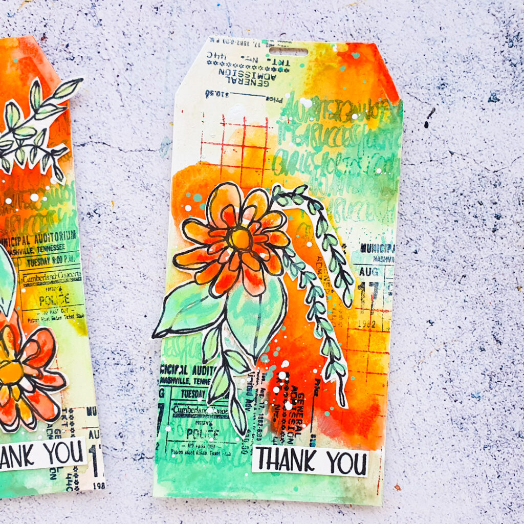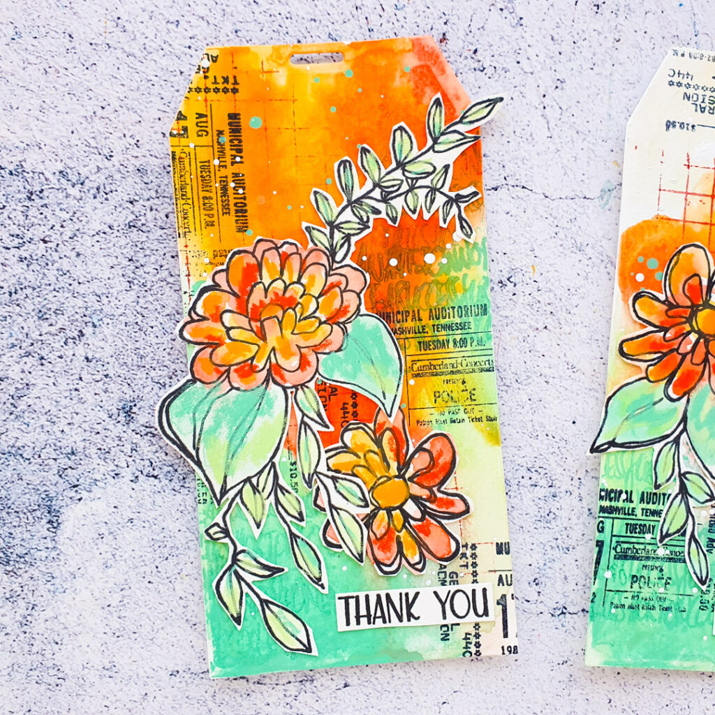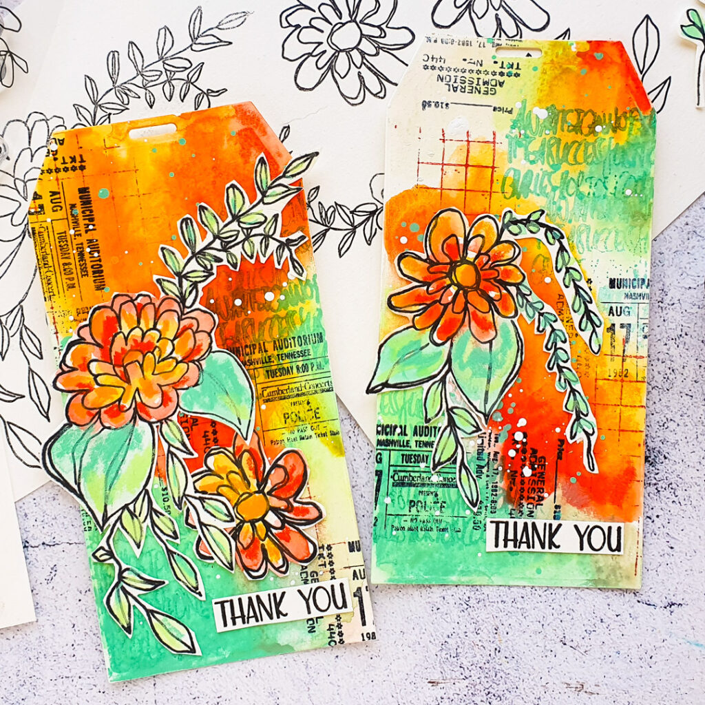 I used the “Thank you” sentiment form the Sketchy Flowers 3 set, stamped it to a separate piece of cardstock and adhered it to the tags.