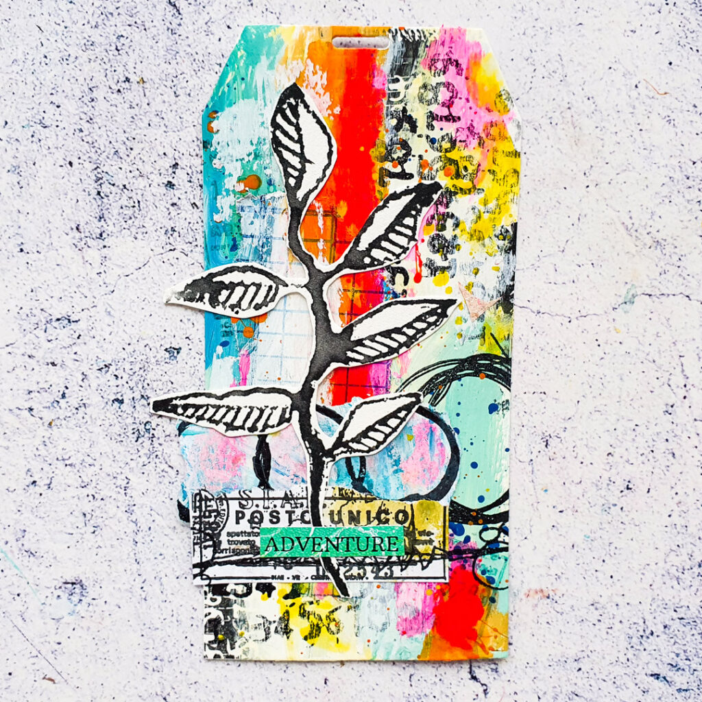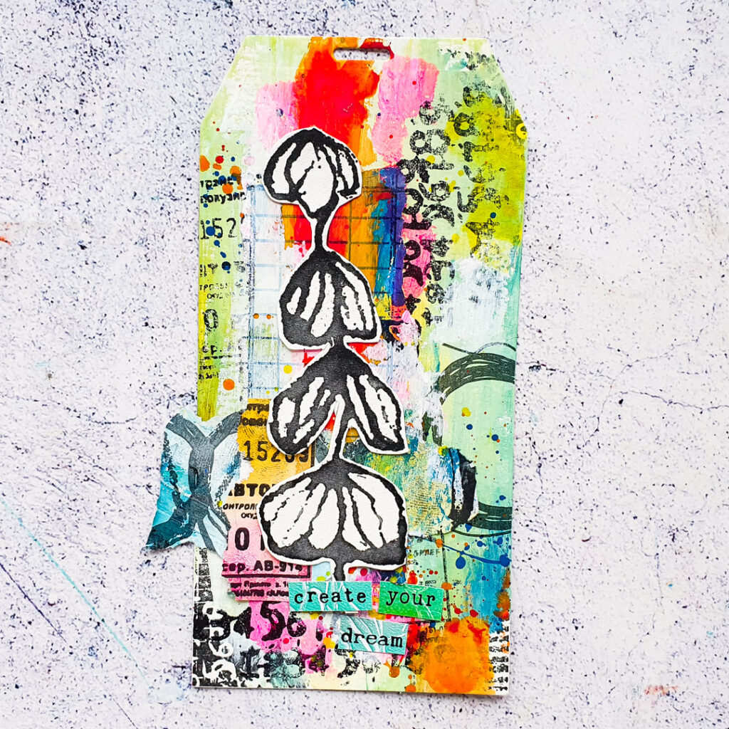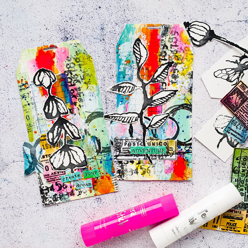Making these tags was quite messy but also so much fun. I just had a play with different layers of gouache paints, stamping and collage. I used some normal gouache tube paints and also some gouache sticks, which are really fun to play with. For my focal images I used botanical images from Pencil Marks 2 and Pencil Marks 3 . I stamped those with Distress Ink Black Soot to watercolor paper. After I’ve inked up the stamp I spritzed it with a little bit of water before I stamped it. This gave me a nice watercolor look. You will find a quick process video when you scroll down!