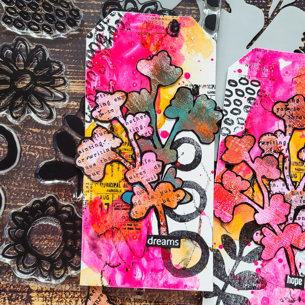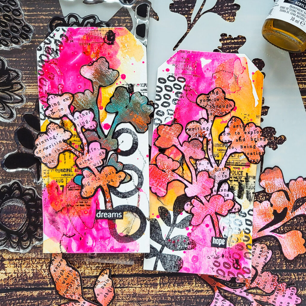Hi there, Susanne here with two mixed media index tags using some of our brand new stamps and stencils! We have 3 new stamp sets and 5 new stencil designs which are 10% off just until tomorrow! So don’t miss this!