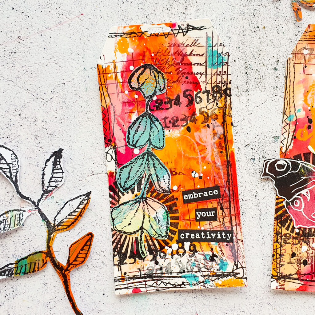 I started by adding acrylic inks to the background. Next I added some mixed media stamping on top with black ink and stamps from Mixed Media Marks 1 and Mix It Up 1. I added some mark making with Neocolors and finished the background with some paint splatters in black and white. To make them look interesting I added a complementary colour to the background. Just a little bit of turquoise with a Neocolor. I picked a left-over paint paper with colors that were matching my tag and stamped a leaf from Pencil Marks 3. Cut out it is a perfect focal point for the first tag.