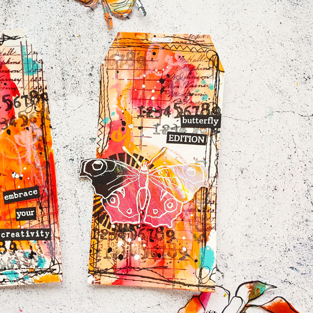 I used the same paper and embossed one of the butterflies from the Inky Friends in white to make a focal point for the second tag.