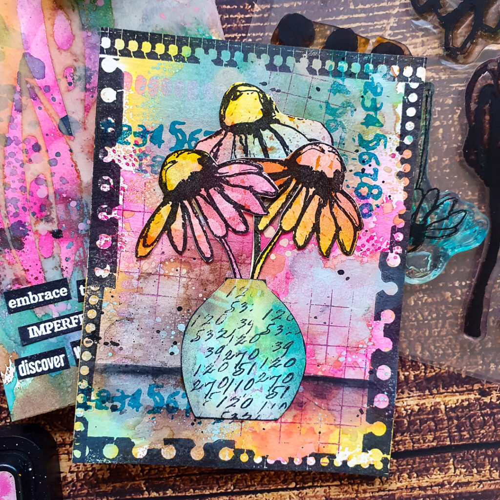 I cut this card (4″ x 5″) from the Canson XL watercolor. The background is made with Distress Inks and Distress Oxides. After this was dry I used acrylic inks to bring in some color. To bring in even more interest I added some stamping to the background with Mix It Up 1 and and Mixed Media Marks 1 sets. I stamped the flowers also onto a Distress background which I had left over from previous projects. The vase is cut out from another left over paper. I stamped the numbers to give it more interest and coloured the edges with black ink, so it pops up from the background.