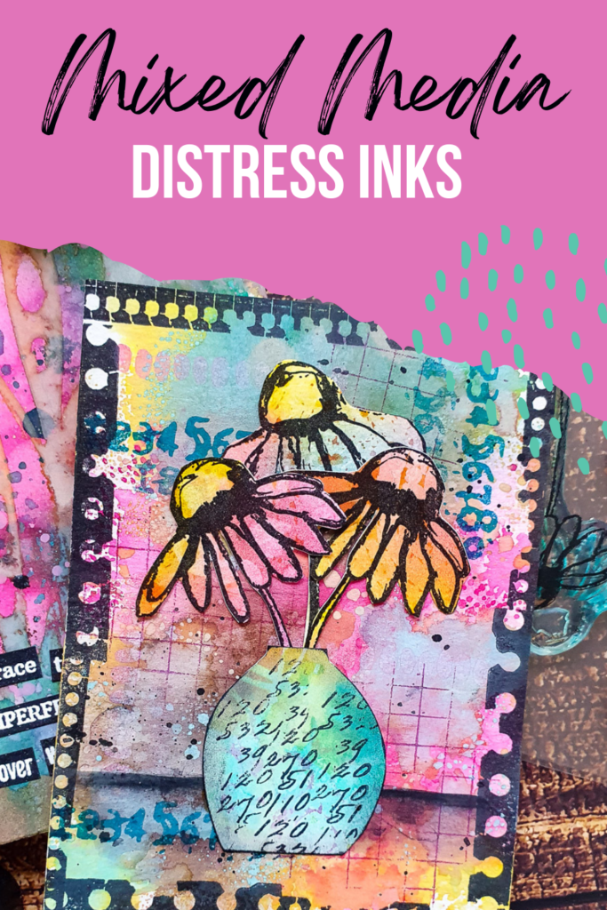 Hi there, Susanne here with a mixed media index card using the lovely flower stamps from our Pencil Marks 6 set on a Distress Ink & Distress Oxide background. To frame the composition is made with images from the Mixed Media Borders stamp set.