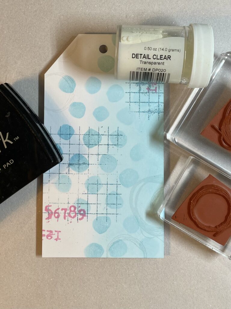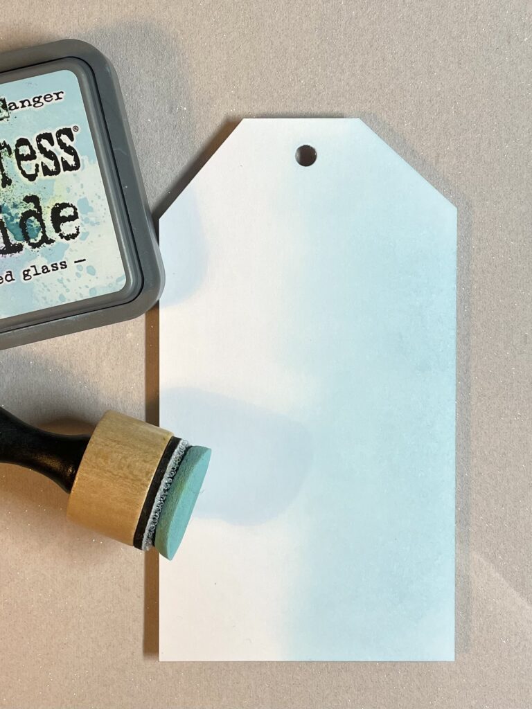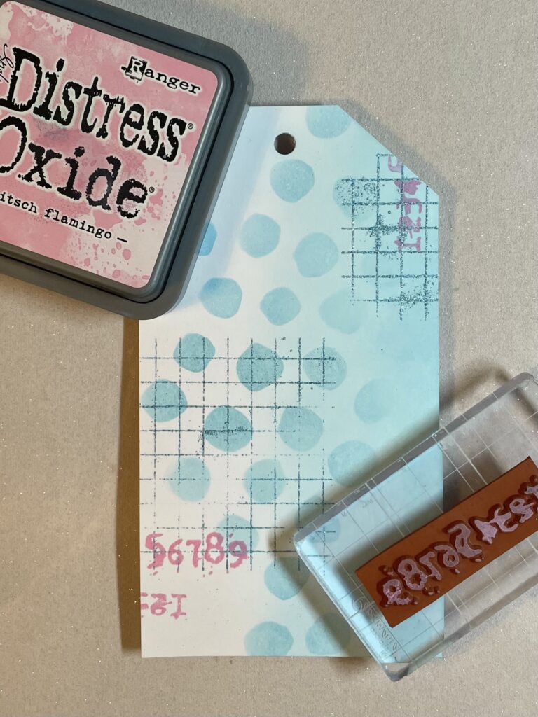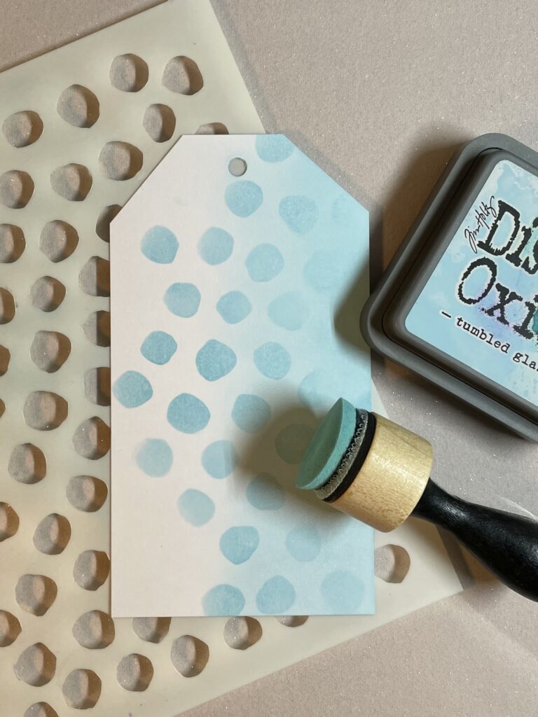 Here is an easy step by step tutorial for you: first up – decorating the tag background with blended Distress Oxide ink & the Ink Dots stencil.