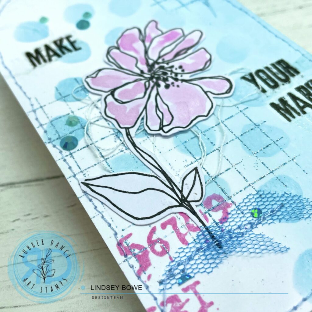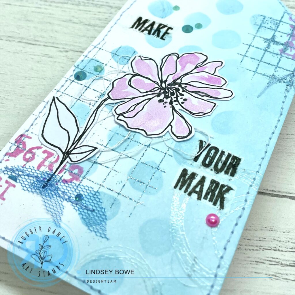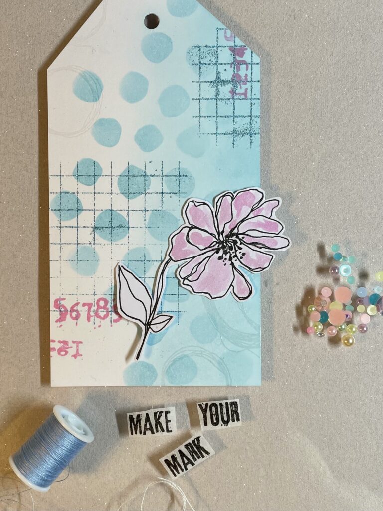 Lindsey (@doodlings_cards) with you today. I have a mixed media tag with a Distress Oxide stencil background, decorated with stamps from the Mixed Media Marks 1 stamp set and a focal image from Sketchy Flowers 3.