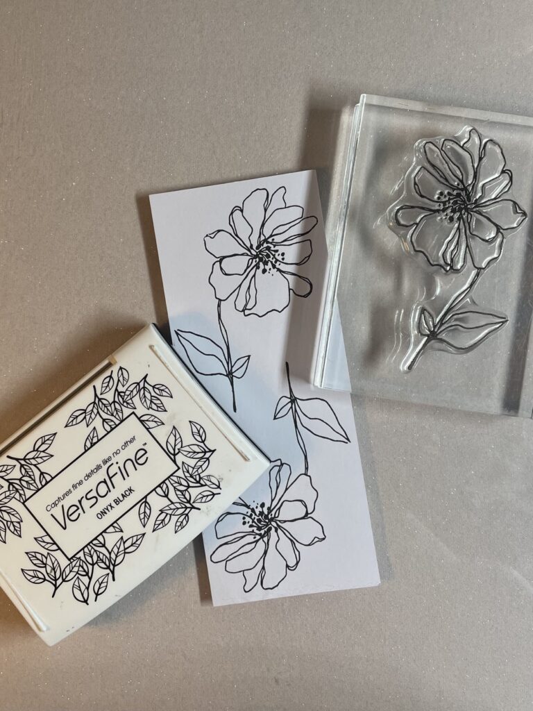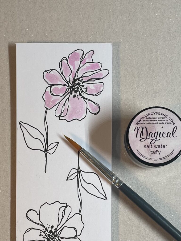 For the focal image, a delicate bloom from Sketchy Flowers 3 stamped in Black Versafine ink, then coloured with Lindy’s Magicals for a spot of shimmer!