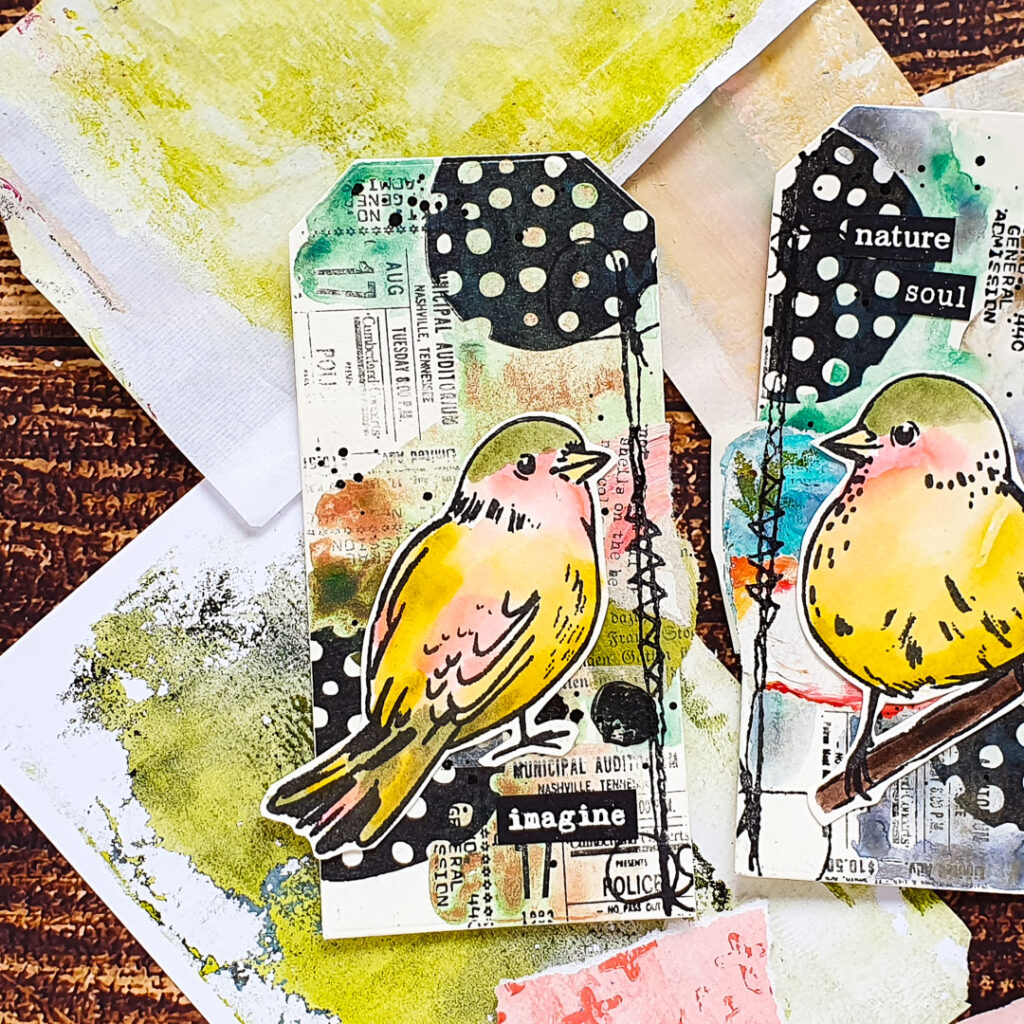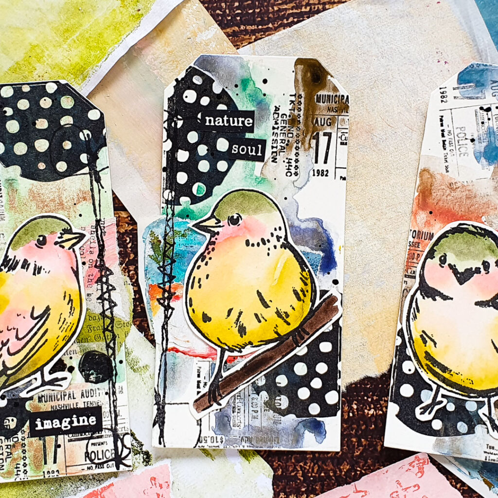 Quick Mixed Media Tags with Sketchy Birds and Carved Collection