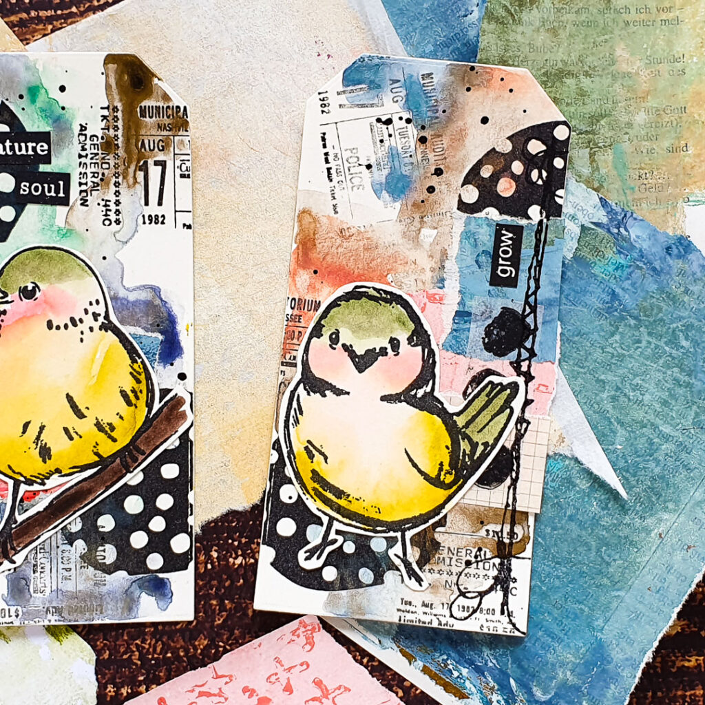 Hi there, Susanne here! I have some inspiration with our new stamps today! I made some lovely mixed media tags with our brand new clear stamp sets, the Sketchy Birds 2 and the Carved Collection 3 Clear! I created a nice mixed media background with some of the carved stamps and watercolors. You will find a video tutorial in the post!
