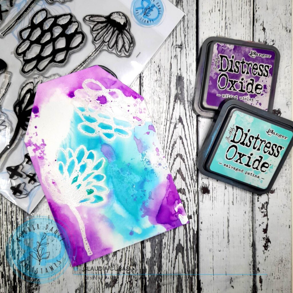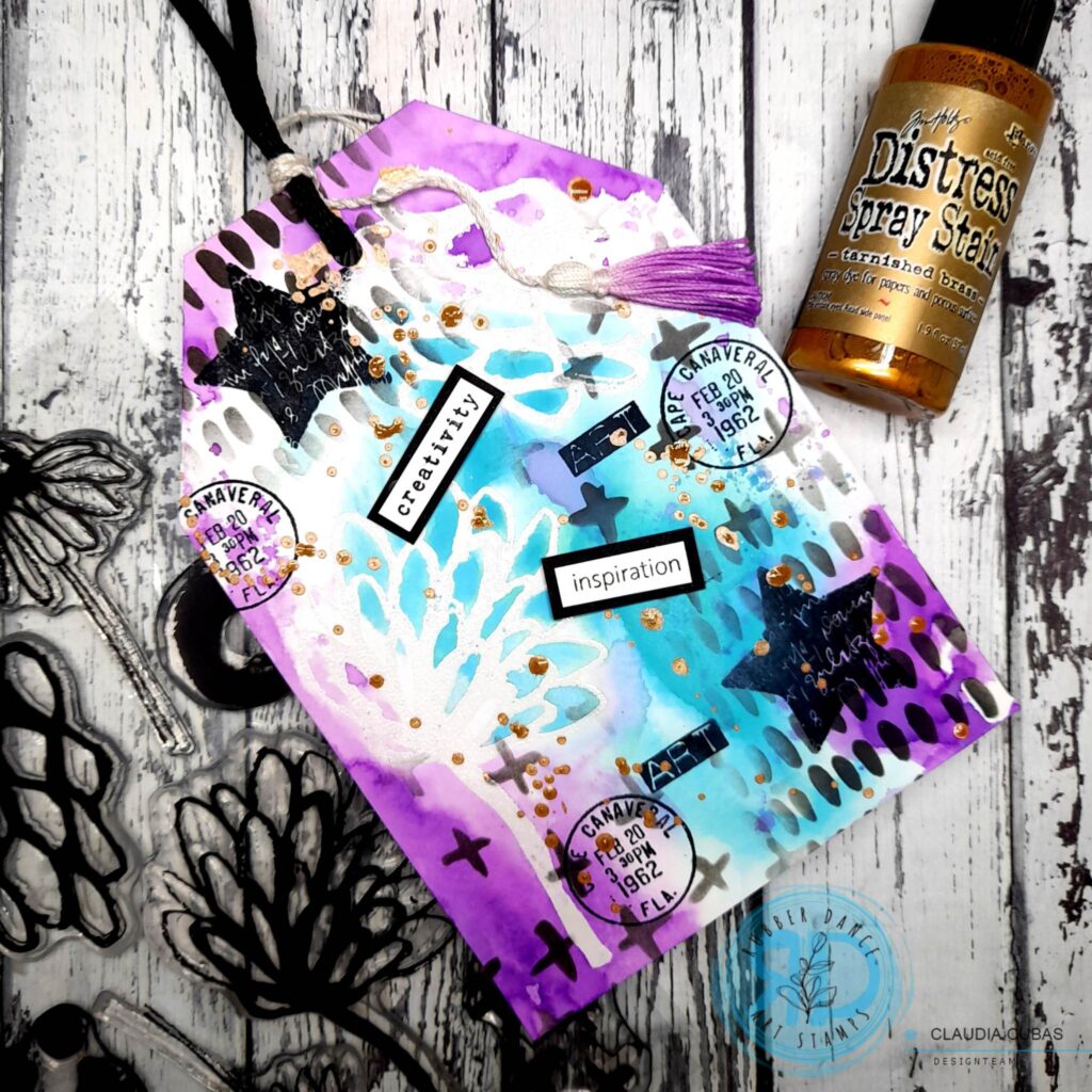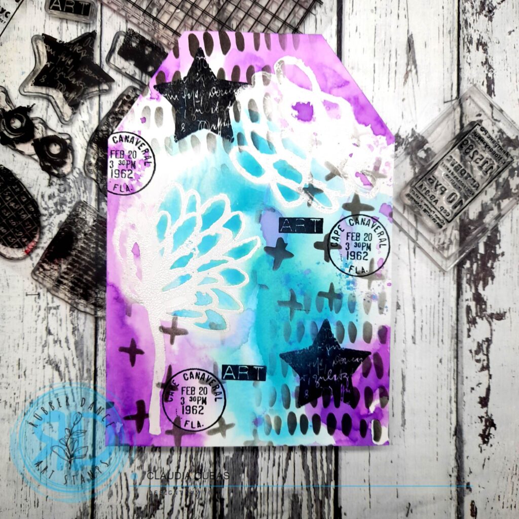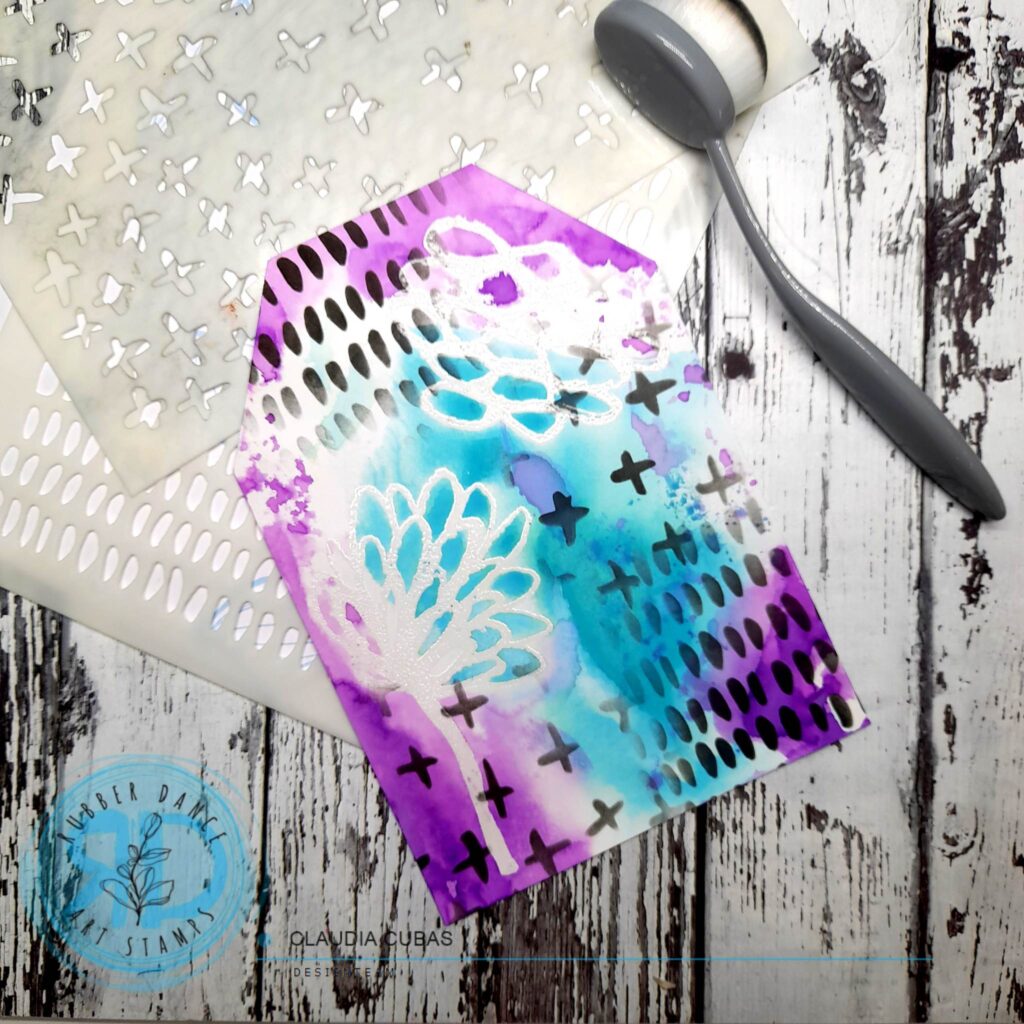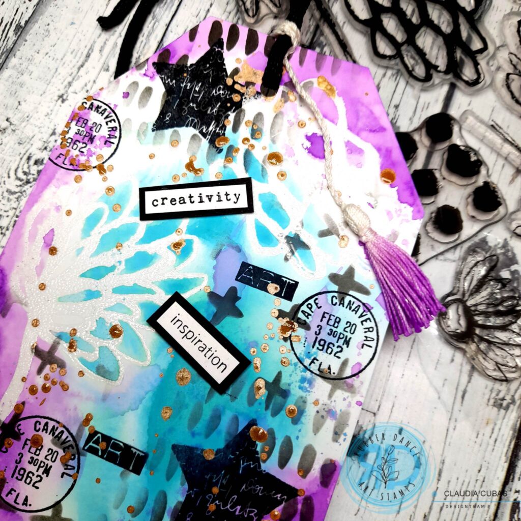 Hello dear friends, Claudia here to keep you company in this hot summer with a mixed media tag using stencils for the background and stamps from Pencil Marks 6.