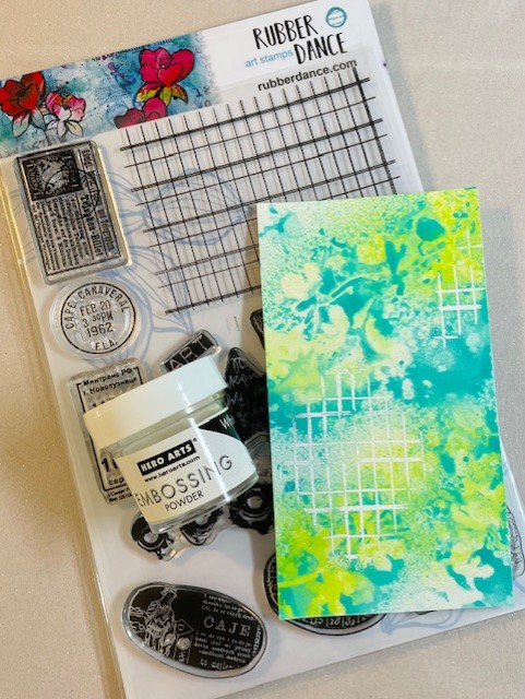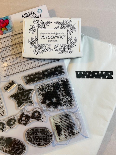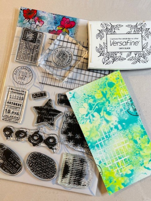 I wanted an element in black ink to draw attention to the colours, so I stamped a “washi” strip on tissue paper.