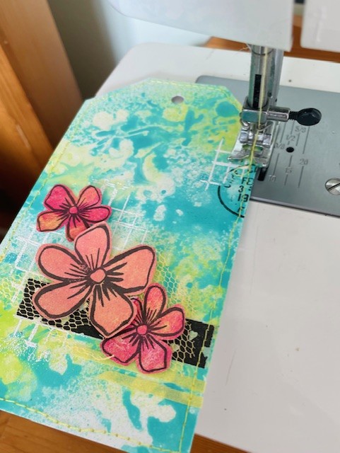 Time to stick down the various collage bits & bobs and fabric and add the ubiquitous stitching around the edge of the tag!