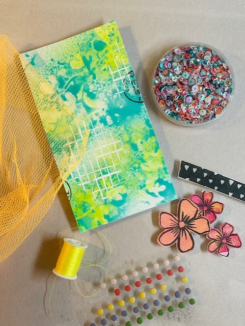 Then found some mesh fabric, thread and sequins in complementary colours.
