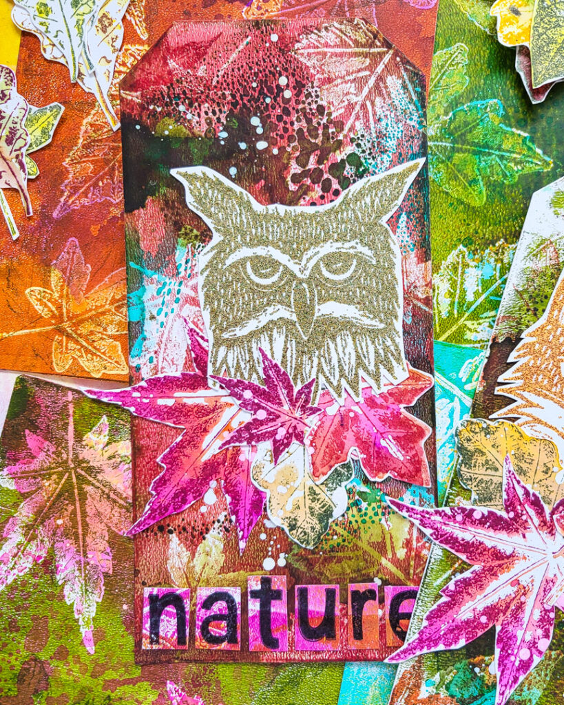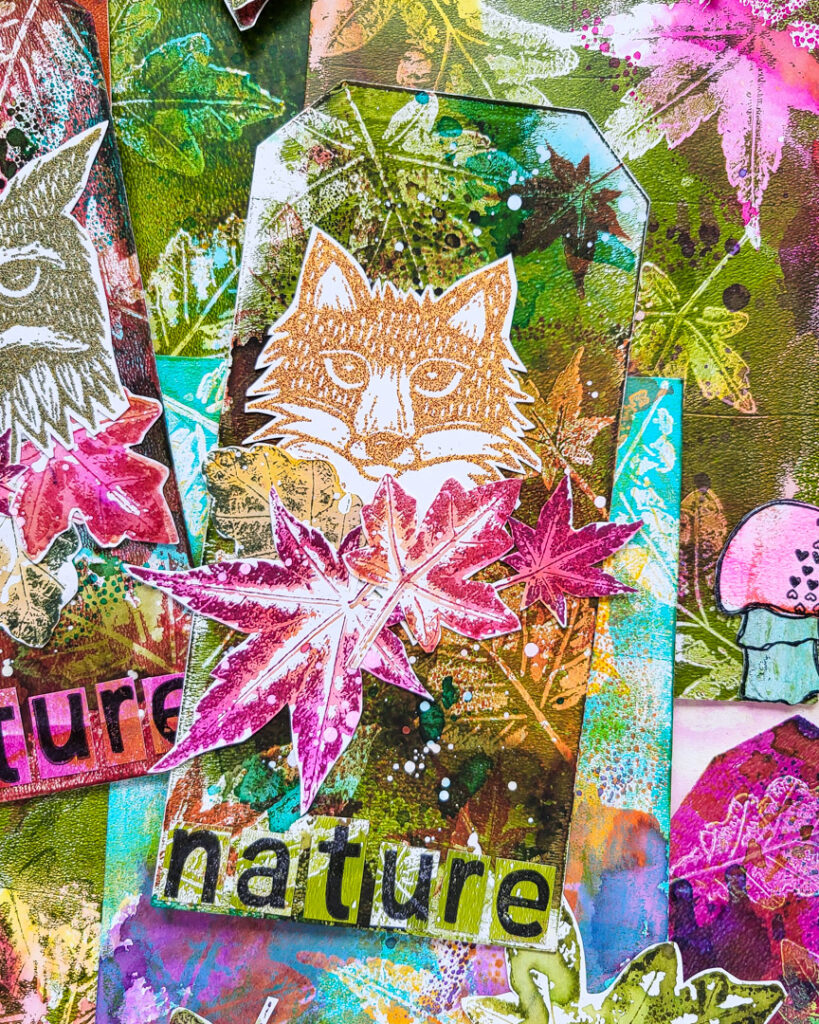 I picked two of the tags I printed last week as my base. As there was already so much texture it was not necessary to add a lot to them. The only thing I applied were some white paint splatters. I then arranged my focal point with some of our Autumn Leaves, letters from A to Z and the Carved Fox and Owl. Unfortunately our rubber stamps are no longer available – so Carved Fox and Owl is not in the shop any more. We have some single rubber stamps left that you can get here.