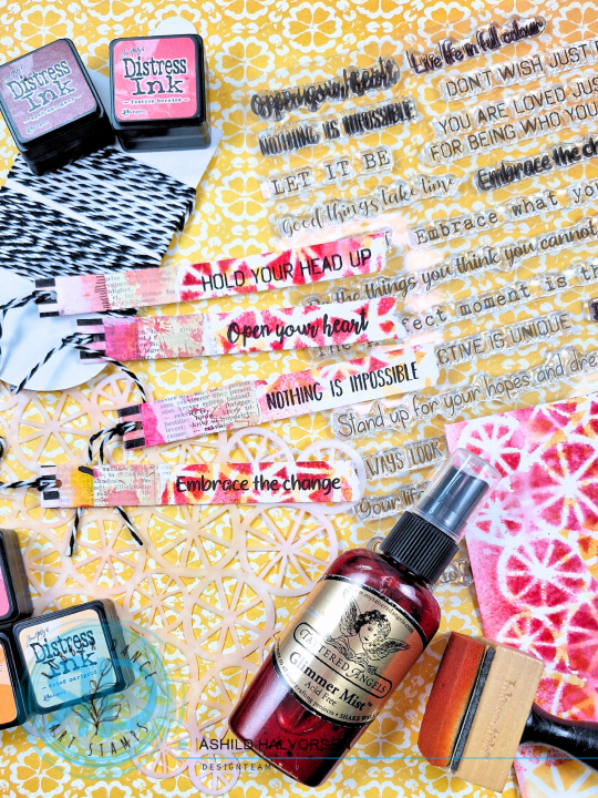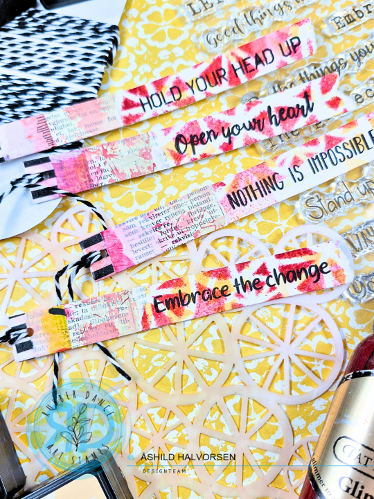 I create a mixed media background using the stencil and Distress Ink pads together with the blending tool from Ranger Ink. I also use some Glimmer Mist. And – yes, I knew it was a clever idea to don’t throw away used bits of masking tape! The bits were perfect for this project! Well, if you want to watch the process, here is a YouTube video for you: