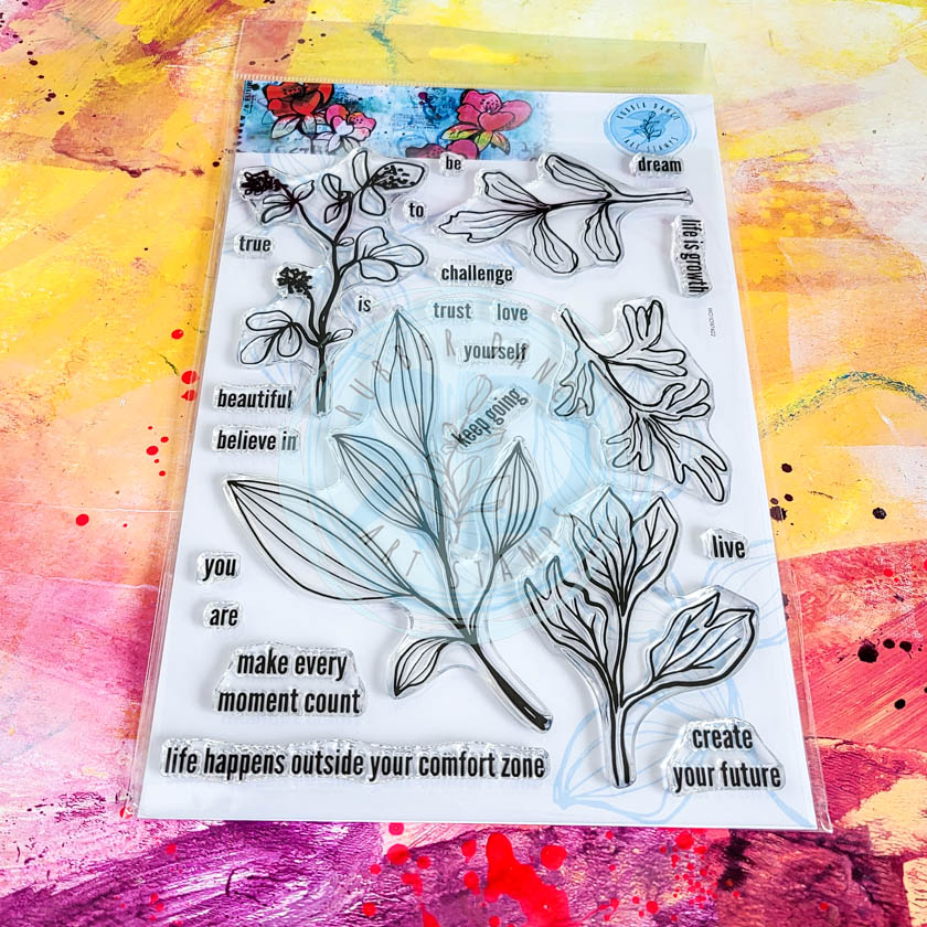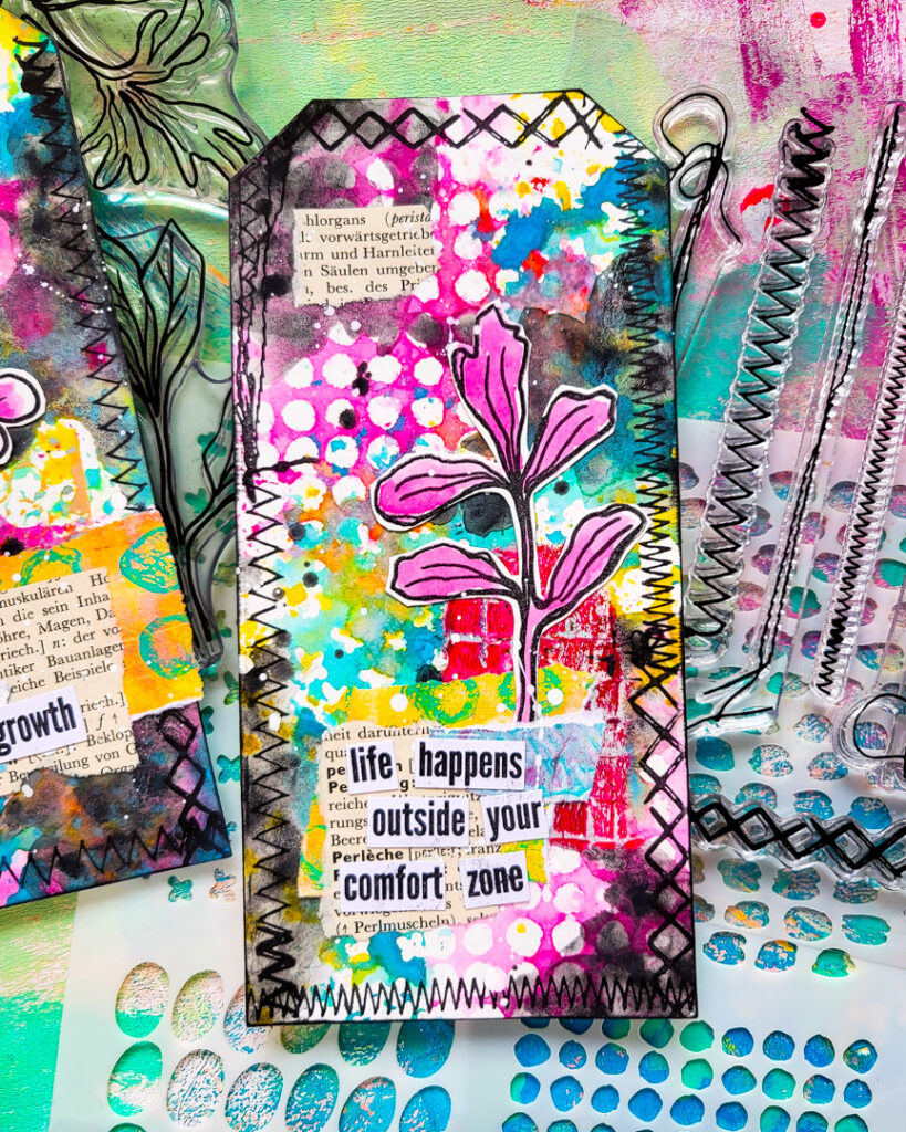 I am finished each tag with some bits of collage paper, a focal image and a title stamped from the brand new Collage Leaves 3 set. I stamped the images to Mix Media paper and coloured them with Distress Ink in Picked Raspberry. I made a few white splatters for some highlights.
