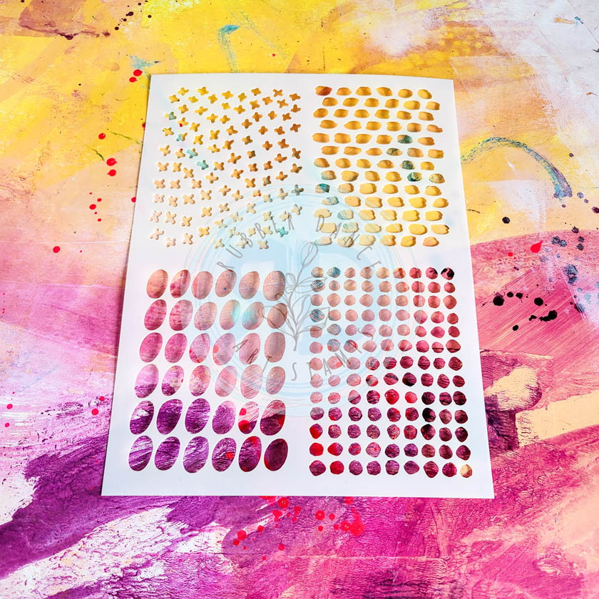 For the backgrounds of the tags I used our new Mini Textures stencil together with Distress Inks and Oxides. I cut the stencil apart into its four textures, so it’s easier to work with. I inked up the stencil with the Distress Ink, spritzed it with water and pressed it onto the background. I used a kitchen roll to soak up the over amount of ink coming out.