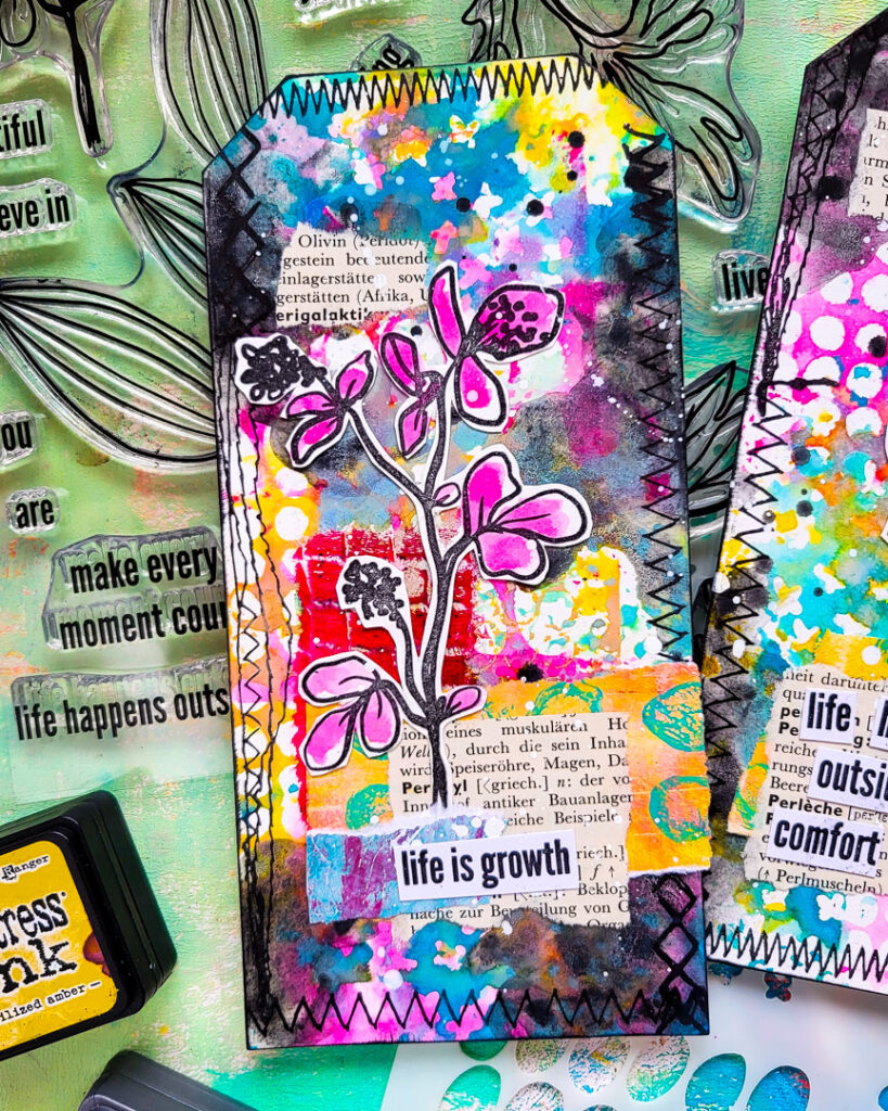 On these tags I used Picked Raspberry (Ink), Fossilized Amber and Peacock Feathers (Oxides). To add a bit of grunge I applied some black liquid charcoal. I stamped a border around the tags with our new Stitching Borders and inked the edges in black.
