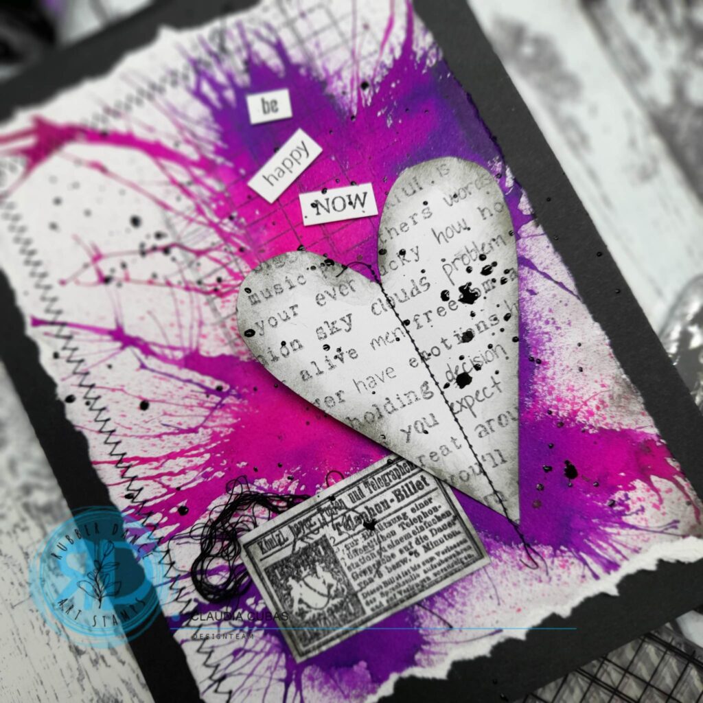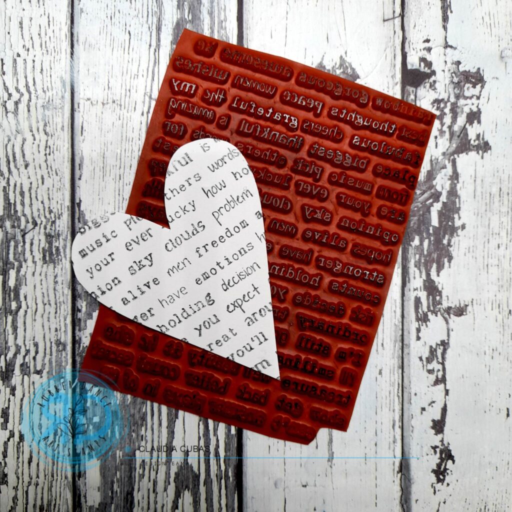 I then cut out a heart on white cardstock and printed the sentiments. I sewed the heart onto the base and with zig zags decorated the edges of the card. If you don’t have a sewing machine you will find some stitching borders on our Mixed Media Borders and Mixed Media Marks stamp sets.