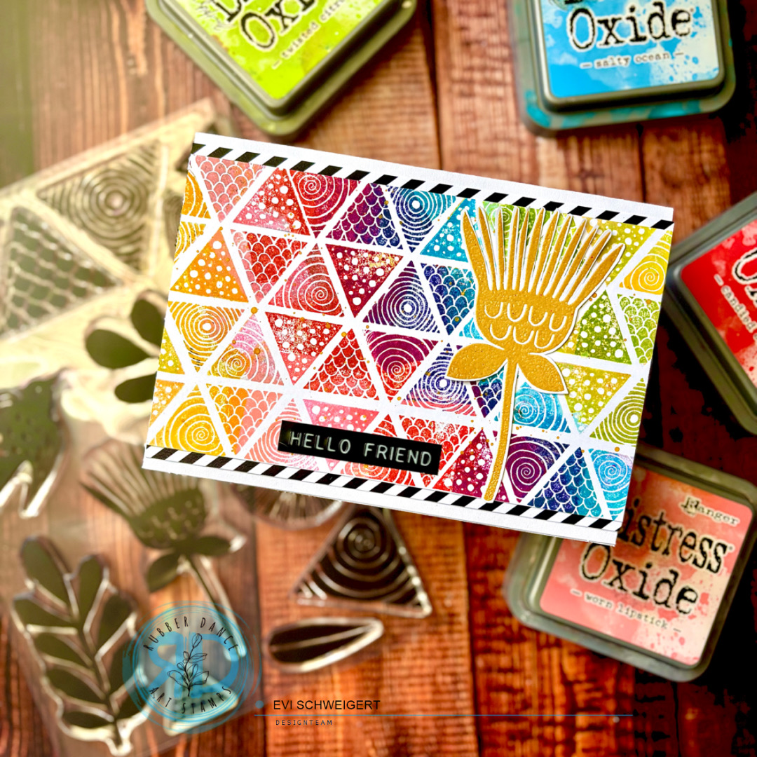 Hey there, today Evi is back on the blog with a greeting card that only requires a single stamp set, the wonderful Carved Collection 6. The background was designed using the small triangles from the set, and the flower in the foreground is also from the set.