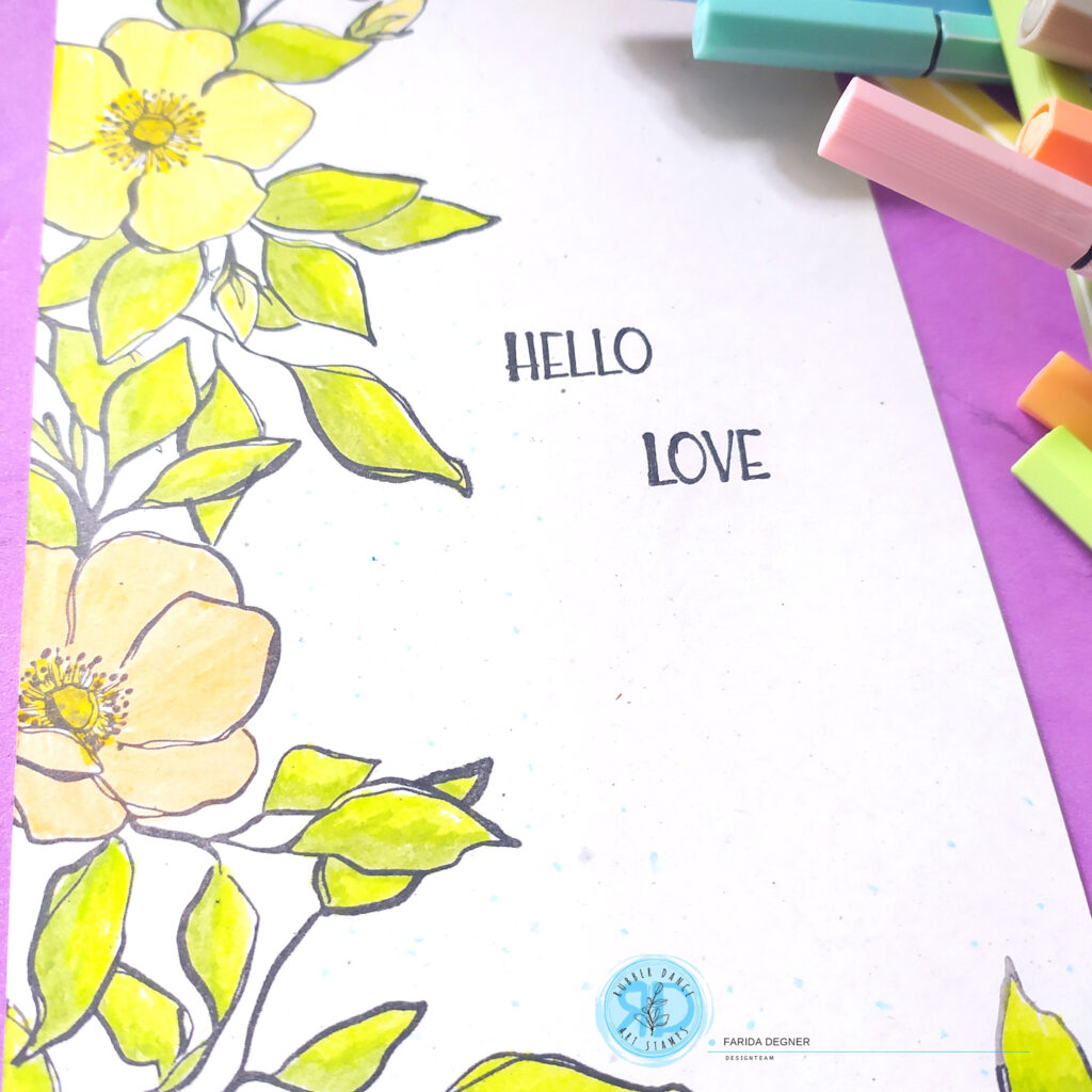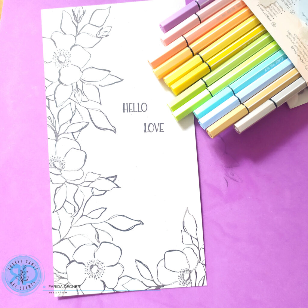Fuzzy cutting around it, on the parts I needed and glued it on the already stamped images. So I can place my next images without having overlapoing lines. The sentiment words are from the Sketchy Flowers #3 stamp set. I have concentrated the images on the lower and left part of the paper piece. And as I had some new pastell coloured pens, I needed to use them for colouring in the images.