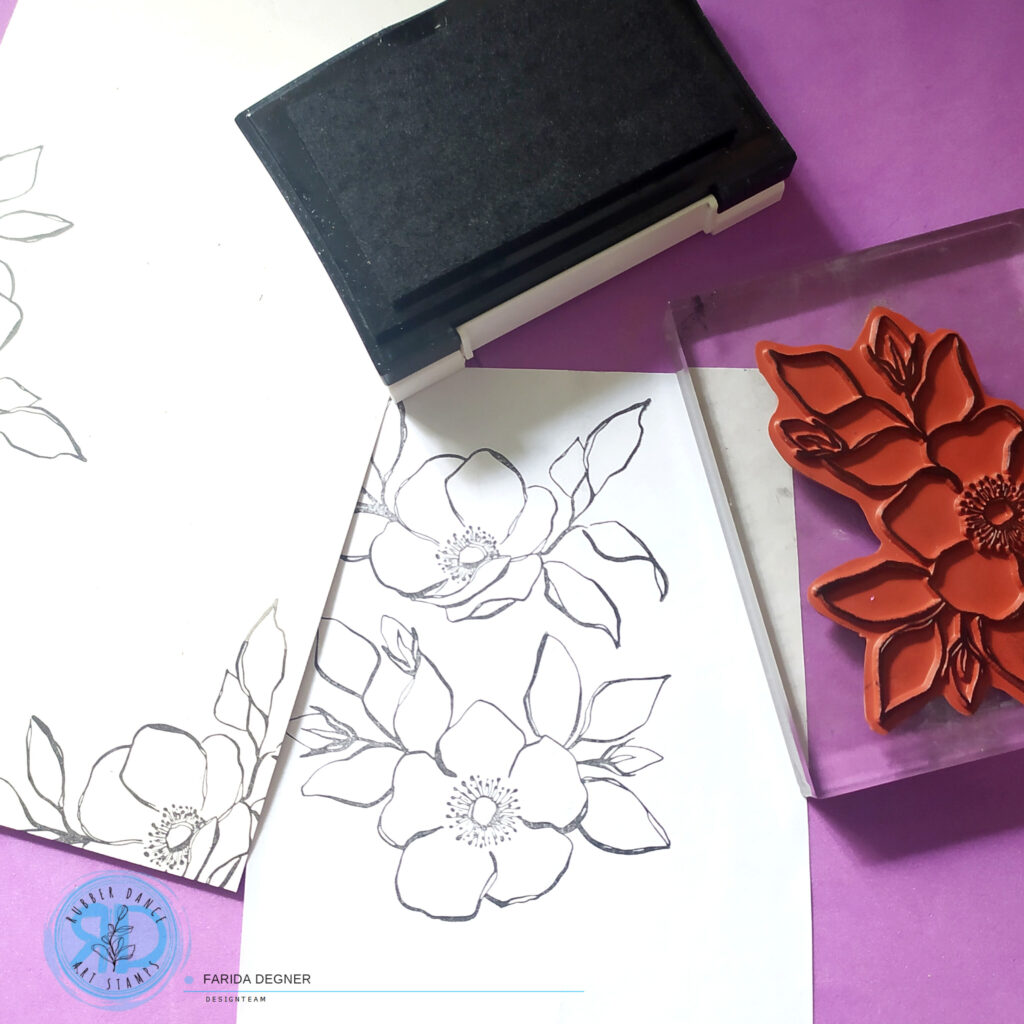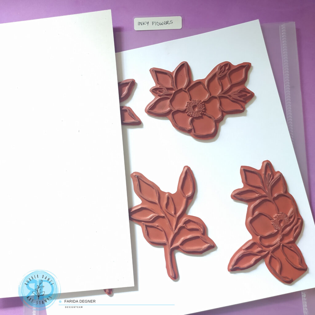 I started with a DIN long piece of paper and my Inky Flowers stamp set. To be able to stamp the images overlapping I used the masking technique. After stamping it on the actual paper piece, I stamped it on an masking paper too.