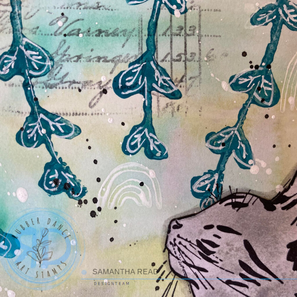 I created the background using the wet on wet watercolour technique and using stamps from the Pencil Marks 1 set and Mix it Up 1 sets. Some I stamped using ink and others I used acrylic paint, if you use acrylic paint don’t forget to clean your stamps right away before the paint dries! I added details with posca paint pens, especially on the leaves coming down which the leaves were also painted in with the paint they were stamped with. The cat from the Garden Cats set is simply stamped on white card, coloured with watercolour paint and adhered in place on top of a small piece of colour coordinating washi tape. Finishing touches were inky splats of black and white and a little shading around the cat before adhering on to my 5 inches by 5 inches card blank. This card could be used for most occasions, I just need to add a sentiment before sending.