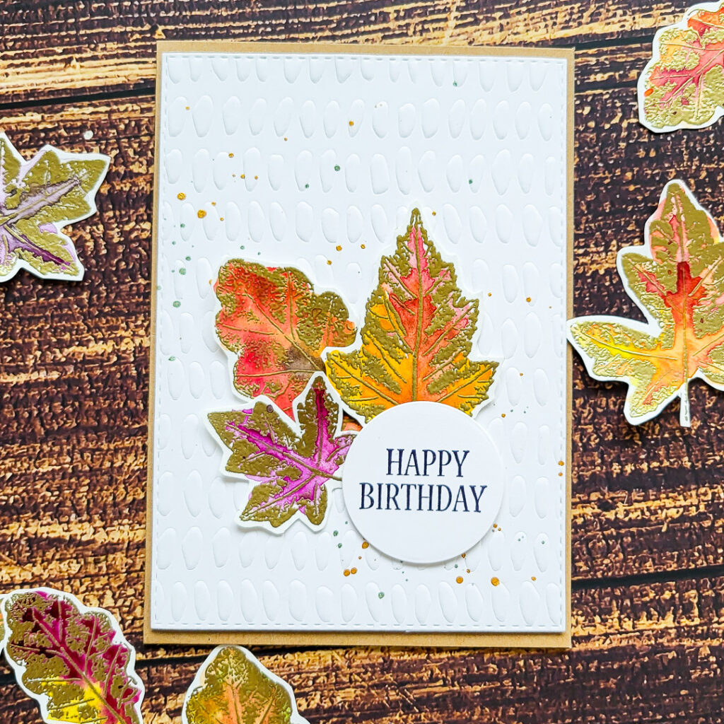 For my card I used a white dry embossed paper and added some interest by splattering metallic watercolors onto it. The leaves are embossed with gold powder and coloured in with watercolors.