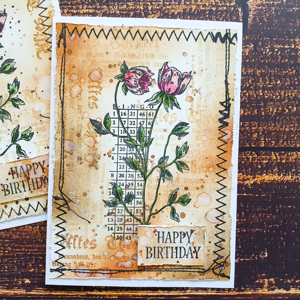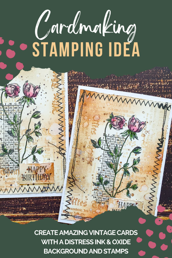 Hi there, Susanne here! Today I’m sharing two vintage greeting cards with a Distress Ink/ Oxide background and stamps from our Vintage Stuff and Mixed Media Borders stamp sets. The technique I am using for the background can be fabulous adapted to any other vintage project or your junk journal pages. Scroll down for a quick process video.
